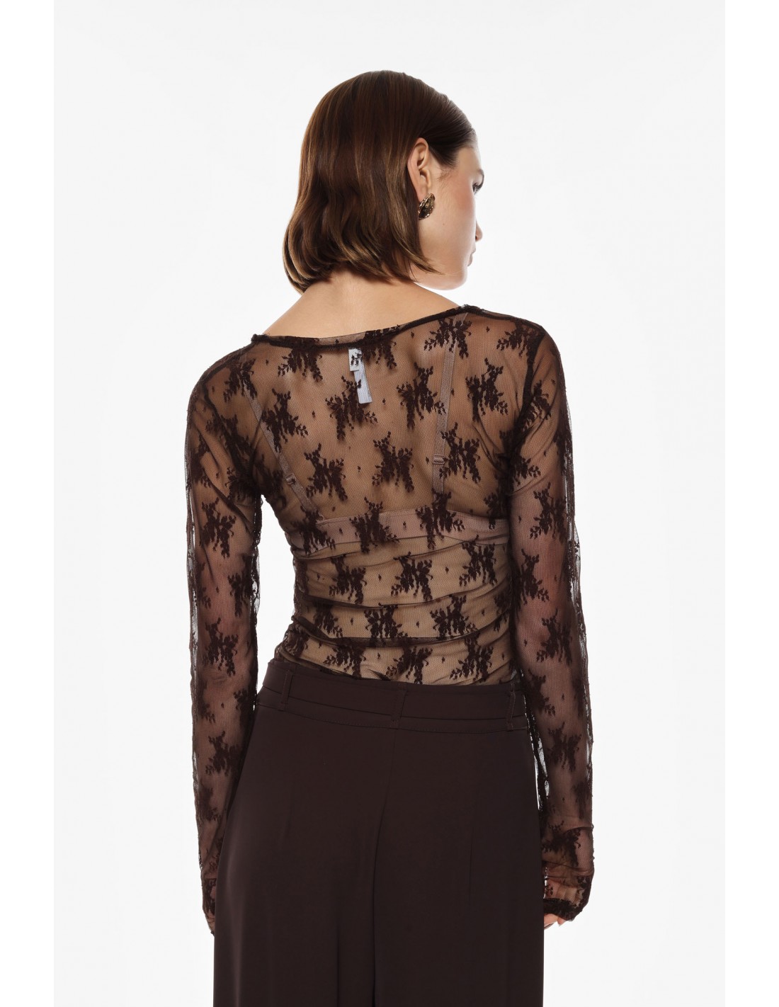 Allure délicate et sensualité discrète : ce T-shirt en dentelle signé Imperial joue la transparence avec élégance. Son col rond échancré met en valeur le port de tête, tandis que la dentelle florale ton sur ton apporte une touche de raffinement. À porter seul ou en superposition, c’est la pièce idéale pour twister un look sobre avec subtilité.