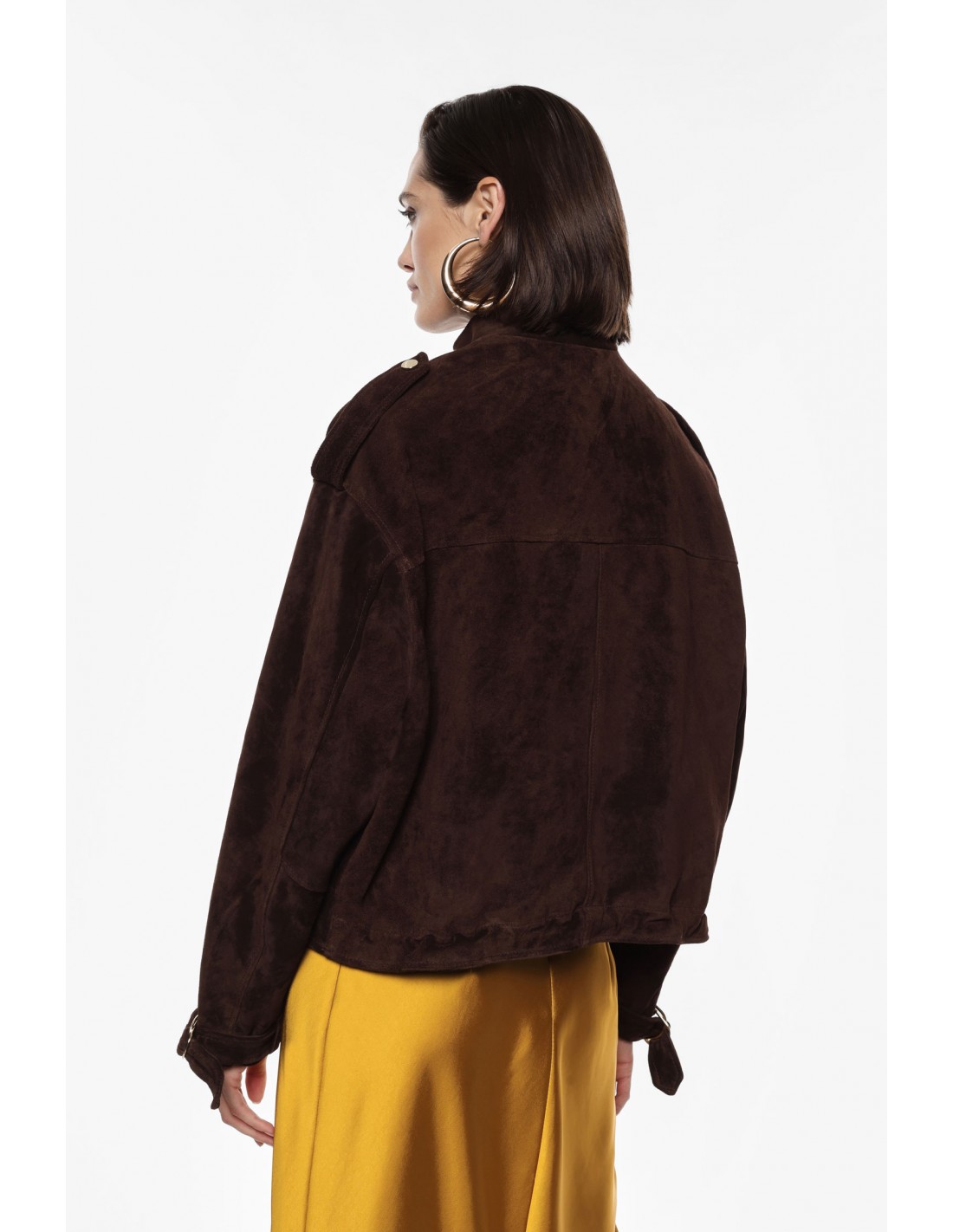 Un blouson d’exception qui incarne le style et la sophistication. Conçu en cuir velours chocolat de haute qualité, il séduit par sa coupe légèrement oversize et sa carrure rabaissée qui apportent confort et modernité. Le col officier, la fermeture zippée sous patte et les épaulettes pressionnées soulignent son inspiration militaire chic. L’accastillage doré vient sublimer la teinte chocolat du cuir, offrant un contraste raffiné et tendance. Une pièce forte qui traverse les saisons avec allure.