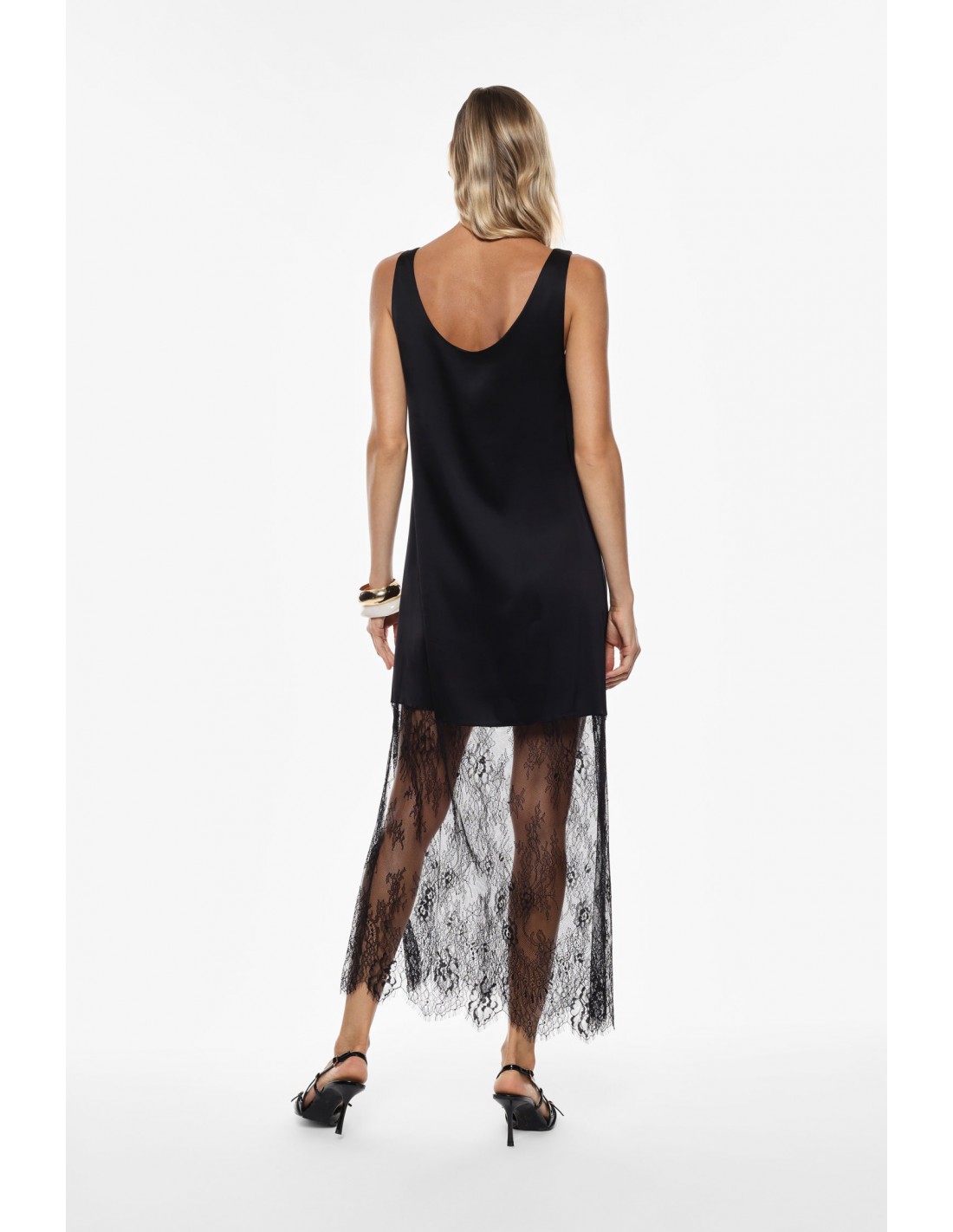 La base de la robe est en crepe satin noir, soutenue par un jupon fixé en dentelle noir