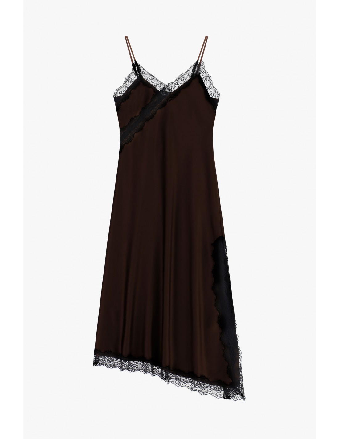 Une robe mi-longue tout en fluidité et en raffinement. Ses bretelles fines réglables et sa coupe asymétrique avec fente latérale mettent subtilement la silhouette en valeur. Les finitions en dentelle au décolleté et à l’ourlet apportent une touche délicate et féminine. Réalisée en crêpe satin au tombé léger, cette pièce incarne l’élégance italienne dans toute sa splendeur.