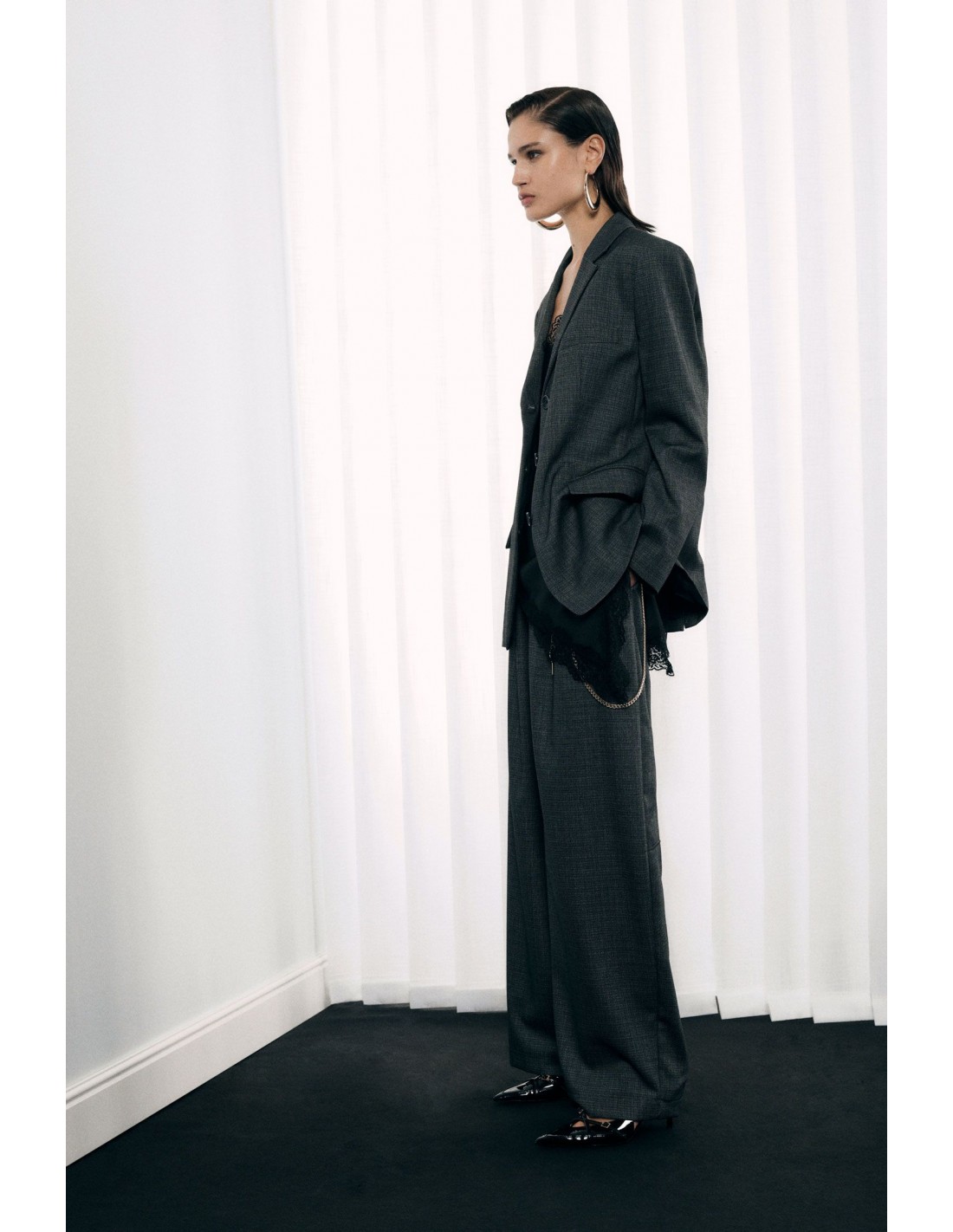 Ce pantalon palazzo Imperial incarne l’élégance architecturale du vestiaire féminin contemporain. Sa taille haute structurée, soulignée par une ceinture métallique dorée amovible, sculpte la silhouette tout en apportant une touche bijou distinctive. Coupé dans un drap piqué au tomber fluide, il allonge la jambe et offre un mouvement ample et sophistiqué. Une pièce iconique, pensée pour être portée seule ou en tailleur avec le blazer coordonné.