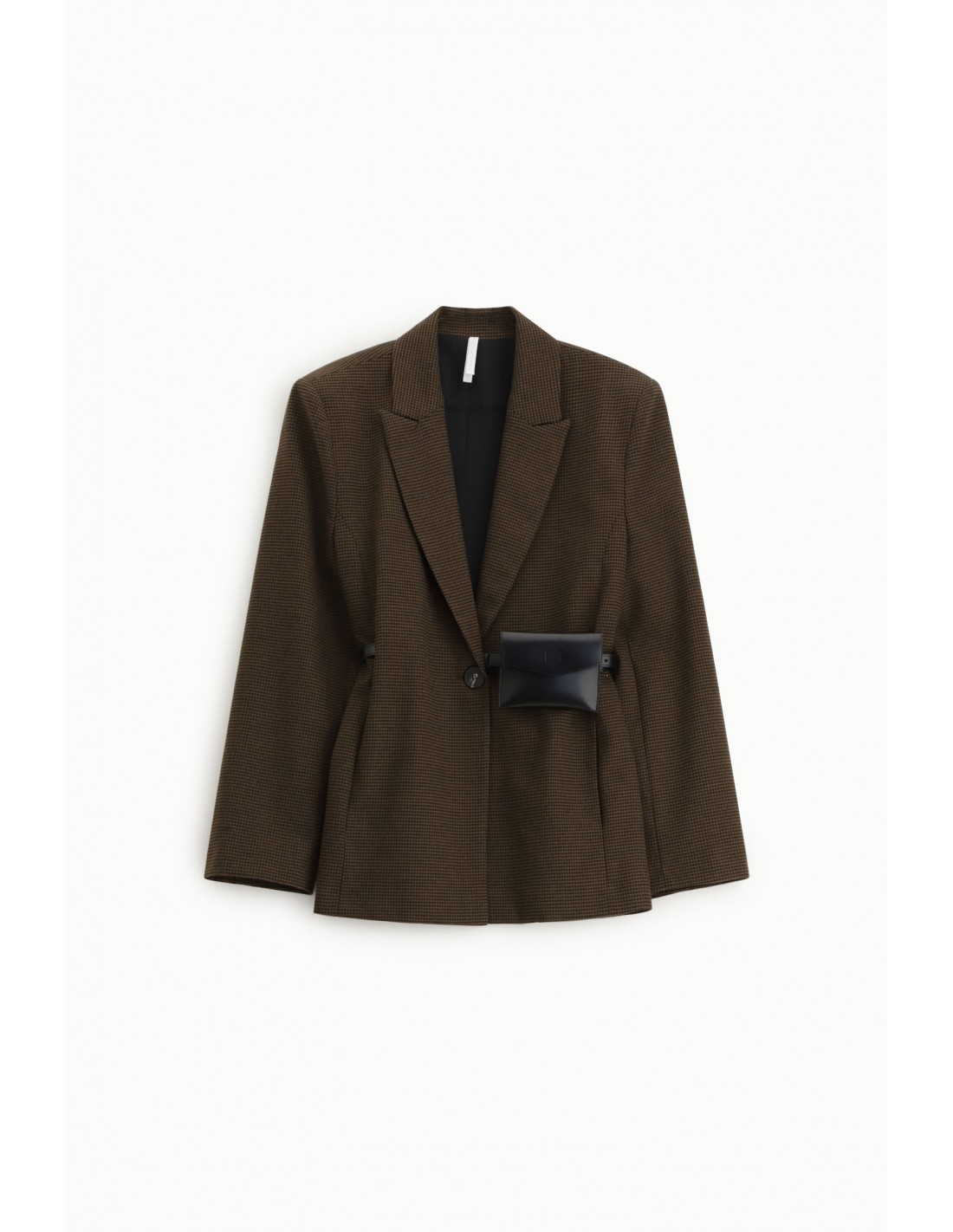 Son tissu drap à motif vichy marron et noir évoque l’élégance intemporelle des créations italiennes, parfait pour la saison. À associer avec le blazer assorti disponible en ligne et en boutique pour un look tailleur moderne et raffiné.