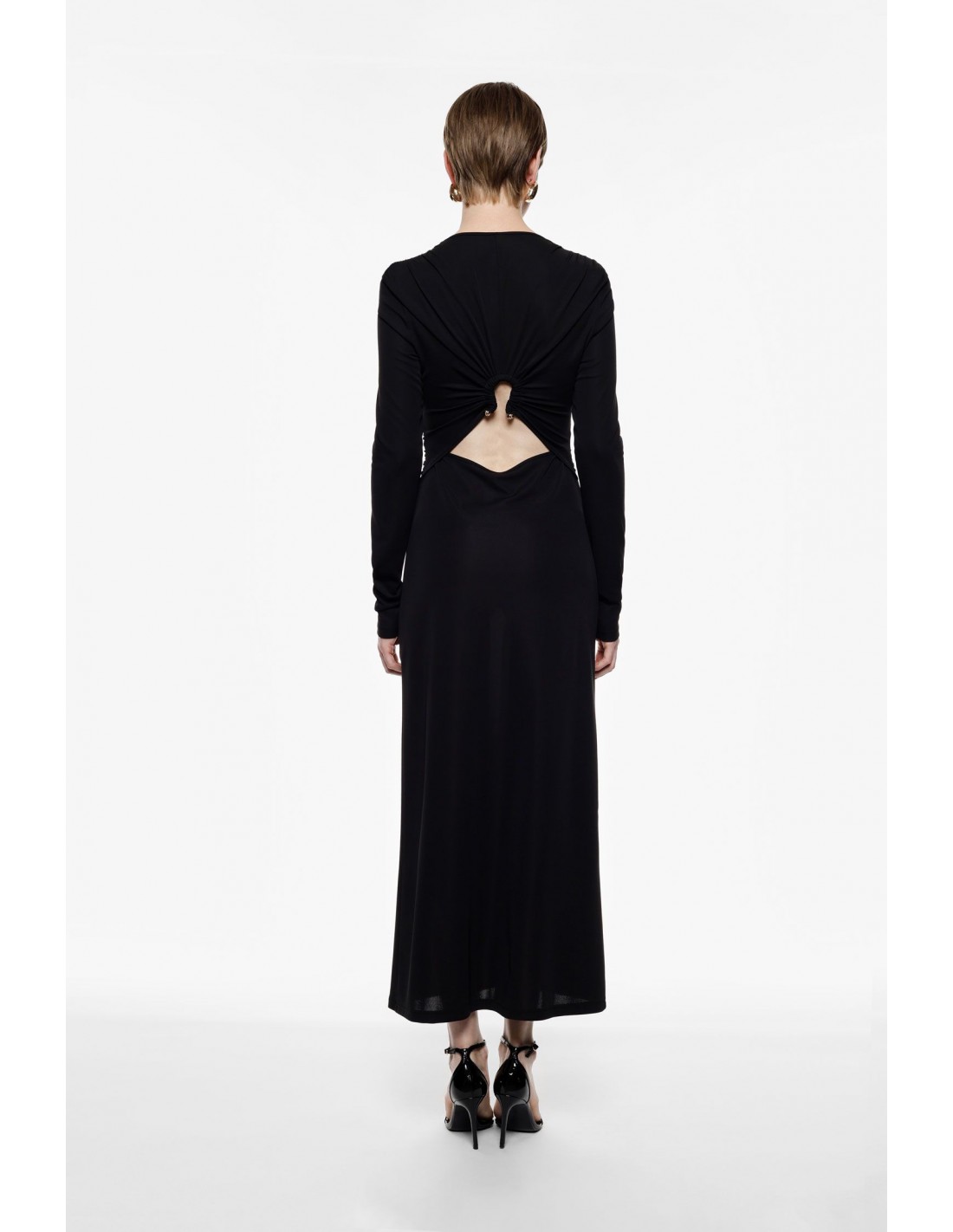 Une robe longue qui sublime immédiatement la silhouette grâce à sa tournure ajustée et son jersey stretch confortable. Son col rond apporte une élégance discrète, tandis que l’échancrure milieu dos ornée d’un bijou de finition crée un détail couture irrésistible.