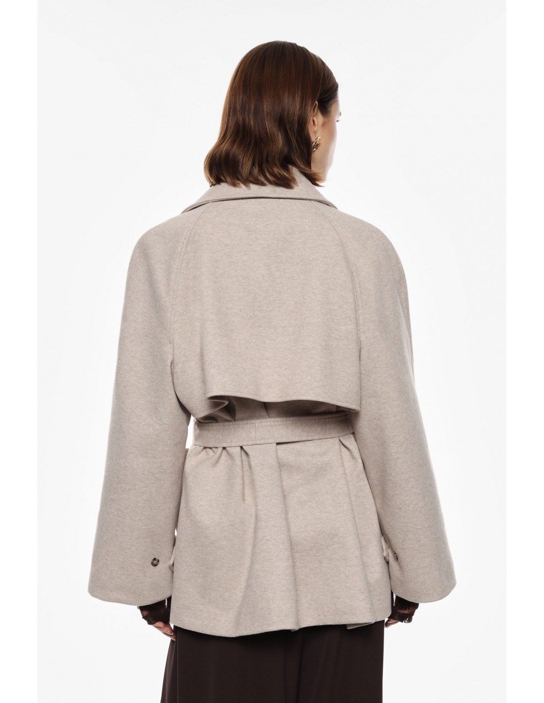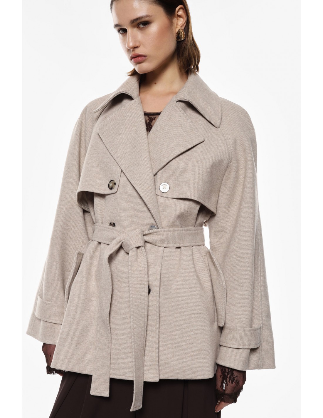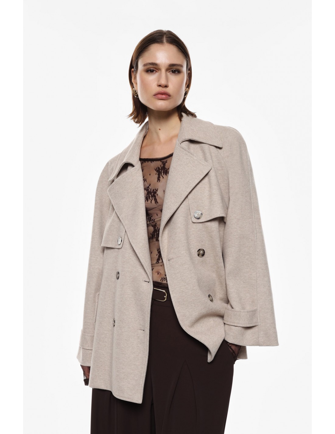 Pièce iconique revisitée par Imperial, ce trench coat court séduit par sa silhouette structurée et féminine. Sa taille marquée et ceinturée met en valeur la ligne, tandis que le col à larges revers, le boutonnage croisé et les rabats boutonnés renforcent l’esprit tailoring de la marque. La pélerine au dos signe un détail couture subtil. Confectionné dans un drap au toucher laineux, il allie chaleur et élégance pour la mi-saison.