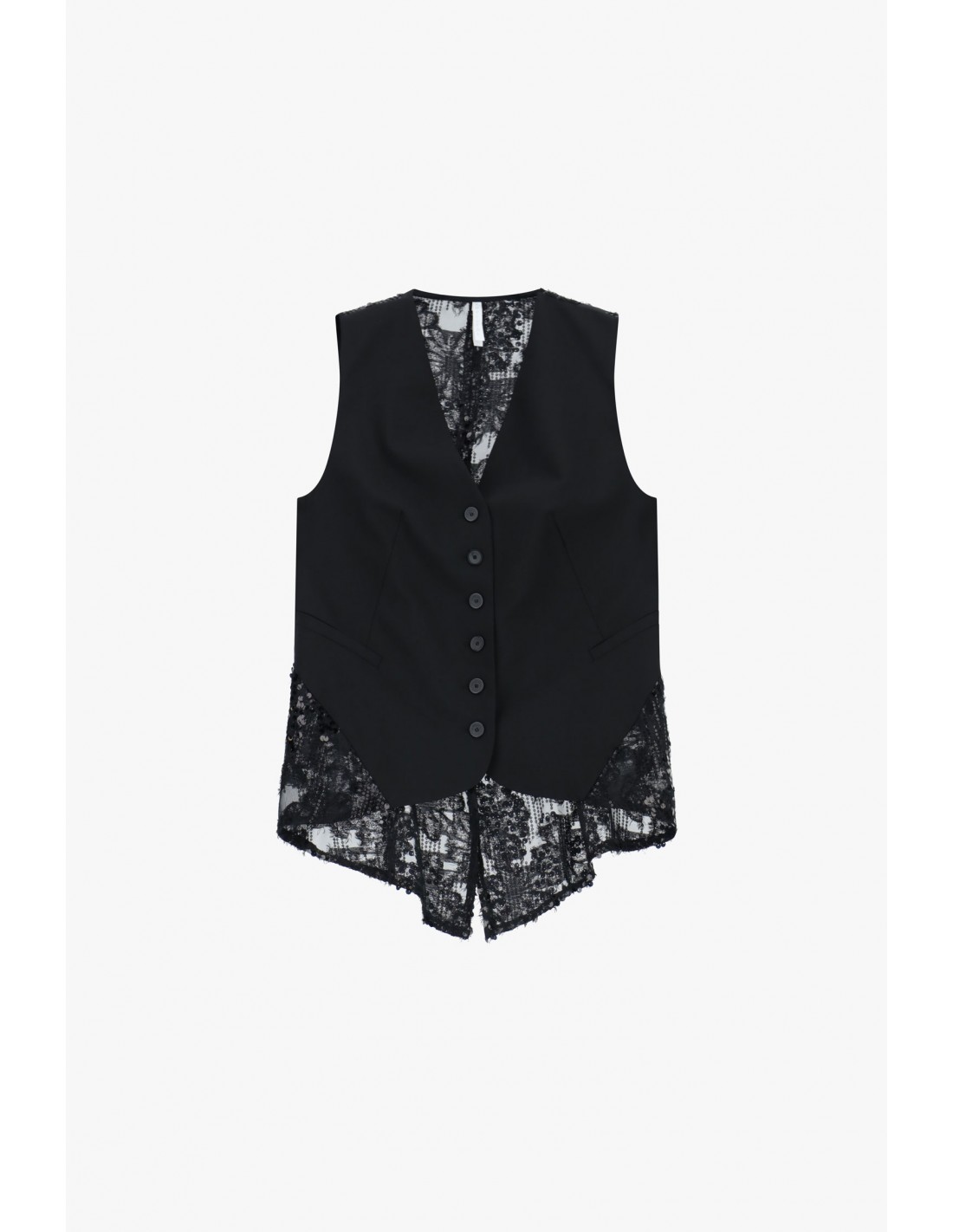 Confectionné en drap sergé noir, il séduit par sa ligne épurée et ses détails en tulle et sequins qui illuminent subtilement la silhouette.