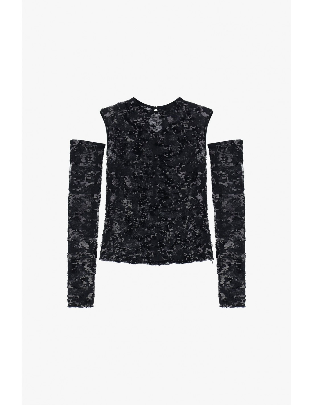 Un top éclatant qui revisite les codes du chic contemporain. Confectionné en tulle souple habillé de sequins noirs, il joue sur les contrastes entre transparence et brillance pour un rendu sophistiqué. Son col rond et sa coupe épurée soulignent la féminité naturelle, tandis que les mitaines assorties ajoutent une touche couture à l’ensemble. Une pièce forte, pensée pour illuminer vos looks de soirée ou vos silhouettes urbaines.