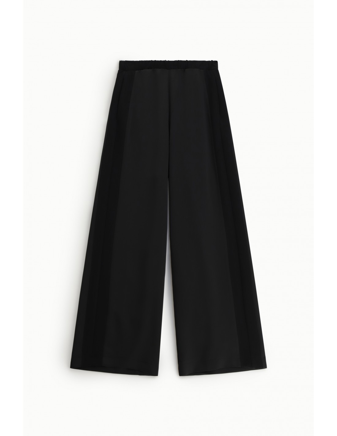 Pantalon palazzo fluide en crêpe satin, jambe large, taille élastiquée, galon latéral jersey, fabrication italienne, livraison express 24/48h, paiement en plusieurs fois, retours possibles.