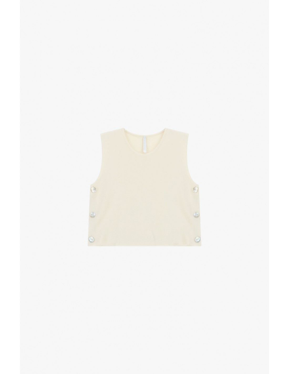 Détails et caractéristiques : débardeur en maille, coupe courte, col rond, boutonnage latéral, tissu maille chaussette, composition 75% viscose 25% polyester, lavable en machine, fabriqué en Italie.