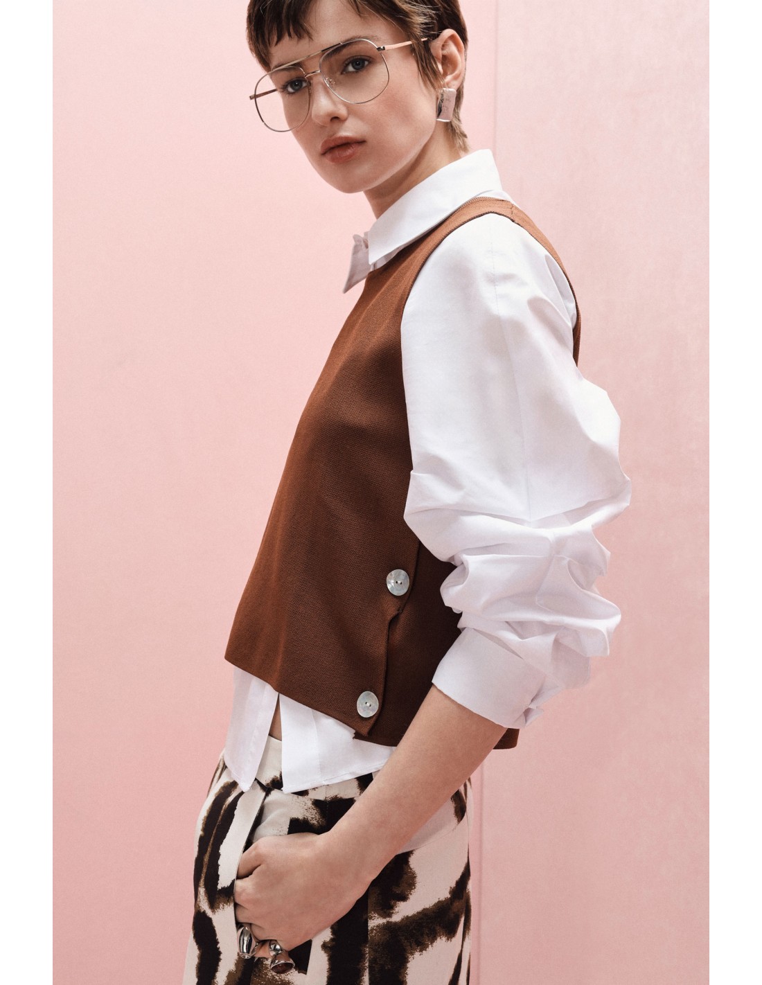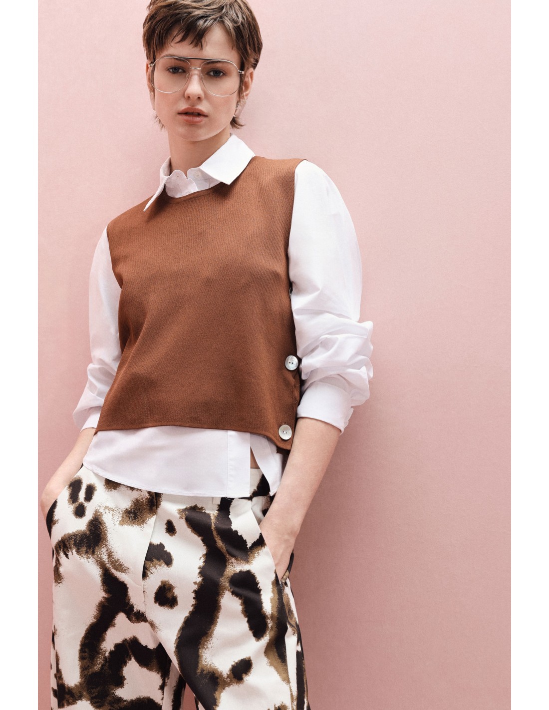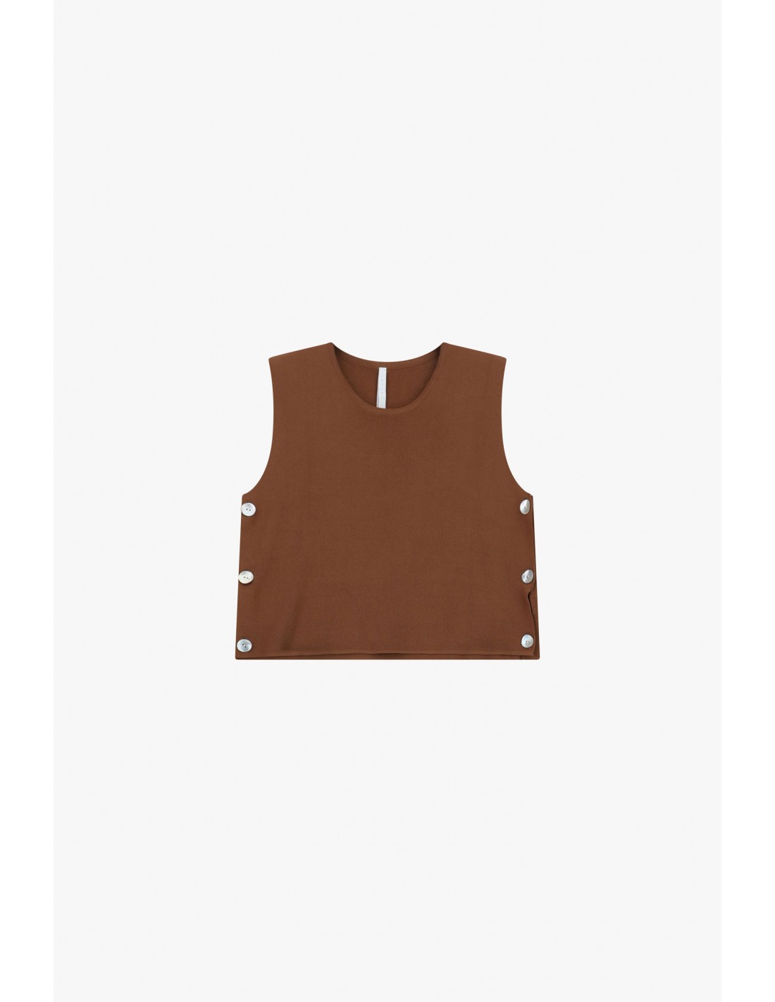 Détails et caractéristiques : débardeur en maille, coupe courte, col rond, boutonnage latéral, tissu maille chaussette, composition 75% viscose 25% polyester, lavable en machine, fabriqué en Italie.