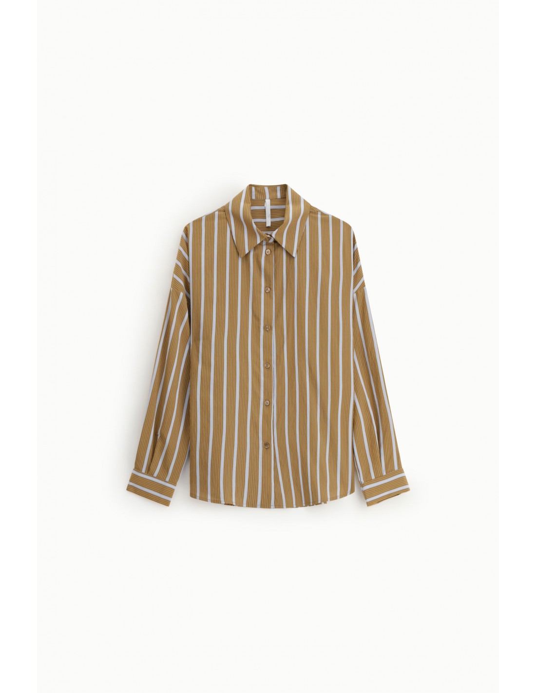 Détails et caractéristiques : chemisier oversize, coupe ample, carrure basse, fermeture par boutons sur patte. Tissu uni à rayures. Composition 56% viscose, 14% polyamide. Lavable en machine. Fabriqué en Italie. Tailles disponibles du S au L.