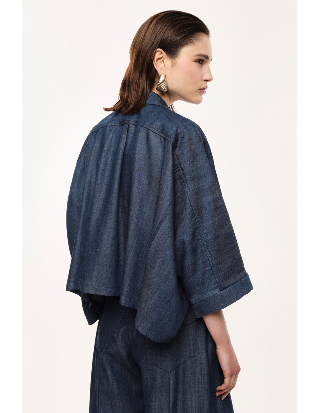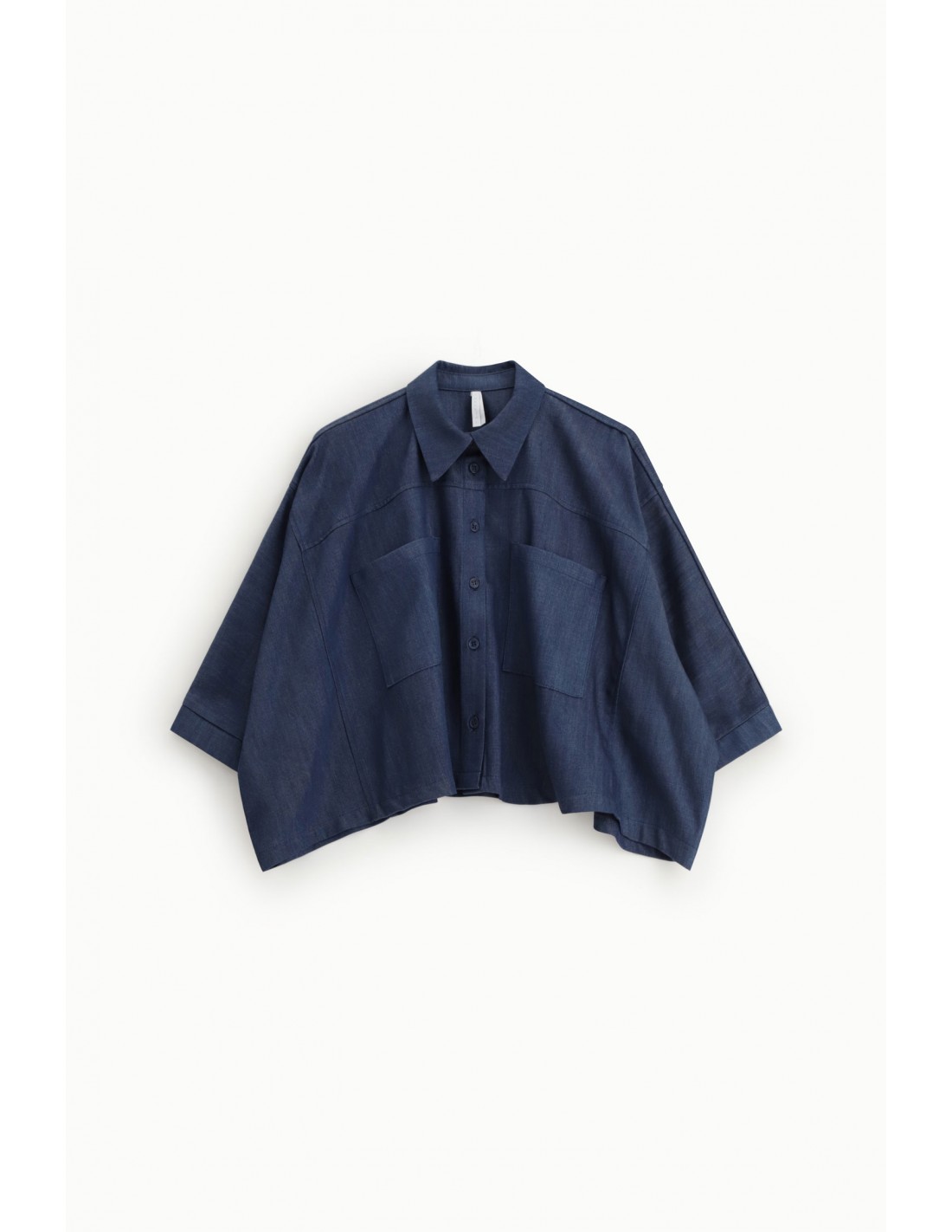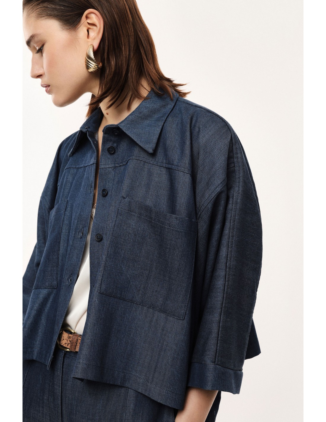Cette chemise Imperial Femme est une pièce forte, pensée comme le complément naturel du jean palazzo assorti. Sa coupe oversize croppée crée un jeu de volumes contemporain, équilibré par une carrure basse et des manches 3/4 à larges revers qui structurent la silhouette sans la figer.