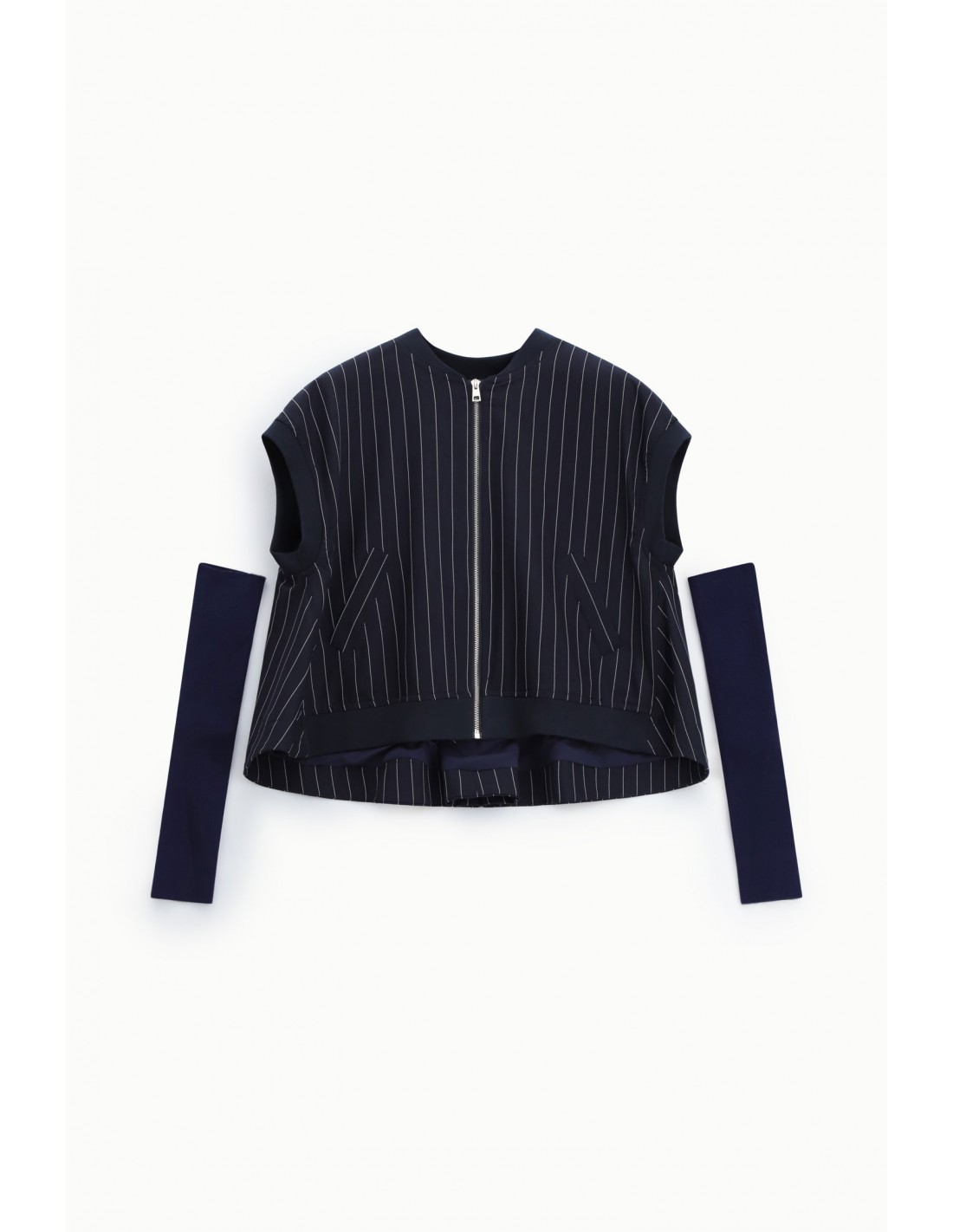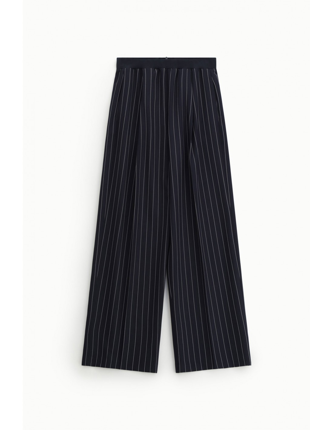 La taille élastiquée à bord-côte assure un confort optimal au porté, complétée par une fermeture dos par zip invisible qui préserve la pureté de la coupe. Confectionnée en drap sergé à rayures, cette pièce combine tenue tailoring et souplesse, pour un rendu élégant sans rigidité. Les poches italiennes et la poche arrière passepoilée signent une finition soignée.
