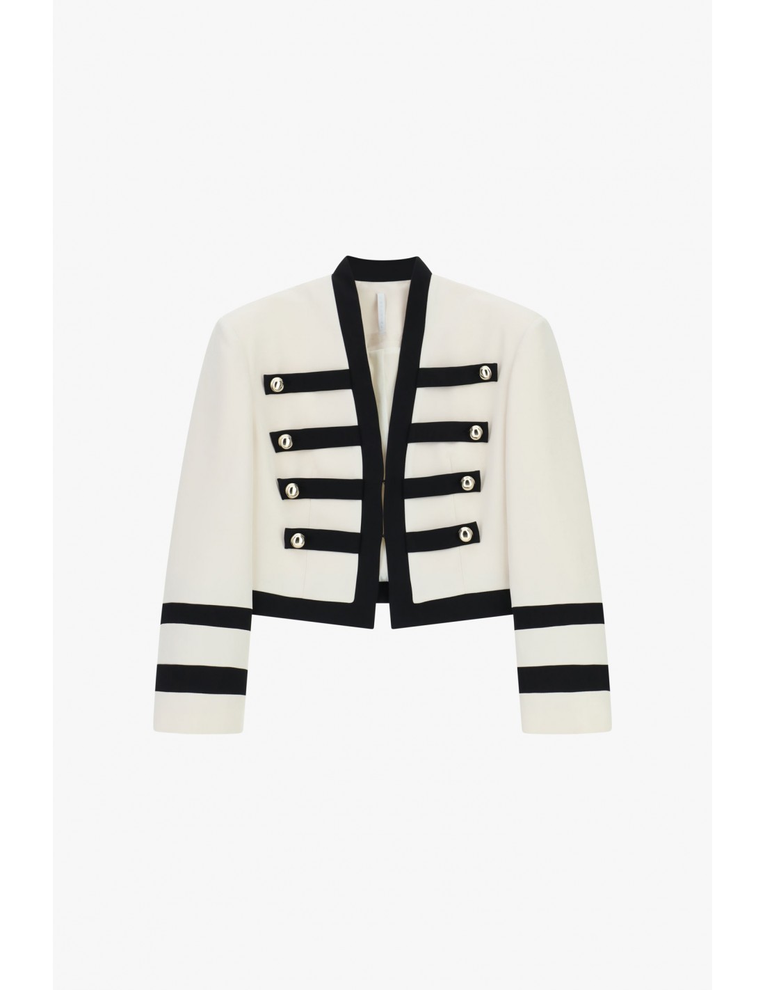 Les détails font toute la différence : passementerie noire contrastée graphique, rangées décoratives structurées et boutons dorés qui signent le style officier. Les épaulettes structurantes donnent de la présence sans alourdir la ligne. La fermeture par crochets fourreurs permet un rendu net et élégant, sans boutonnerie centrale visible.