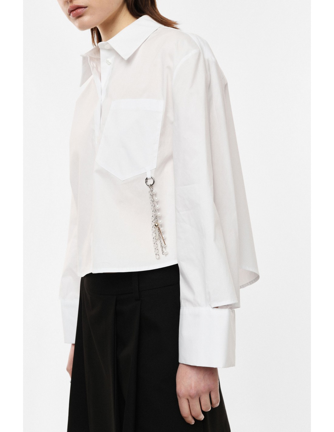 Chemisier cropped signature Imperial Fashion : coupe courte moderne, col pointe souple, poche plaquée avec chaînette décorative amovible et poignets découpés pour une finition mode. Base forte pour looks taille haute et ensembles tailleur. Popeline de coton, fabrication italienne. Livraison express 24/48h, paiement fractionné, accompagnement styling expert. Retours et échanges possibles — retour à la charge du client. Emballage soigné.