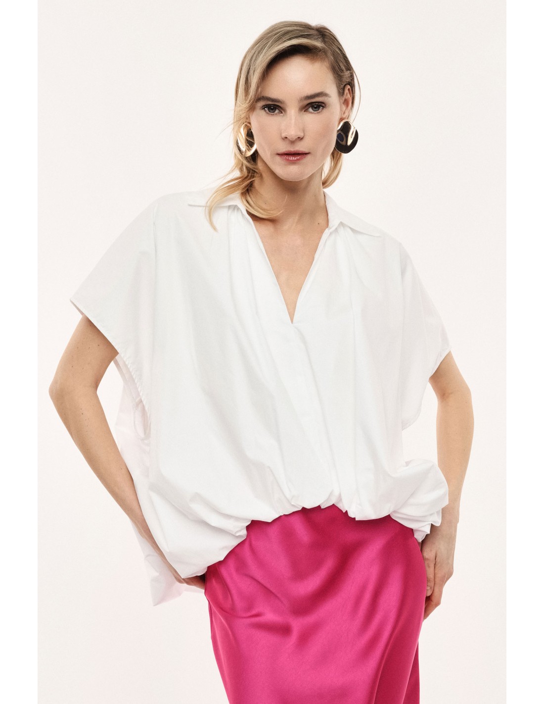 L’ourlet maintenu par un élastique permet de contrôler le volume et de créer un effet blousant naturel, sans rigidité. Le col pointe et le décolleté poitrine ouvrent le haut de silhouette pour éviter tout effet massif malgré l’ampleur de la coupe.