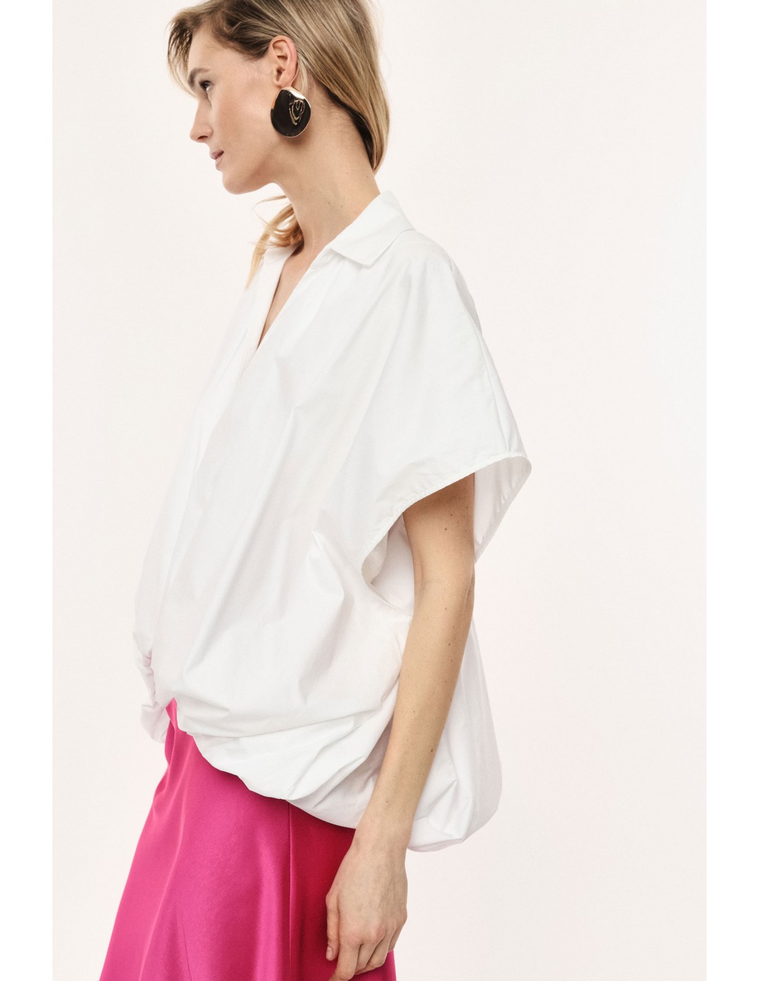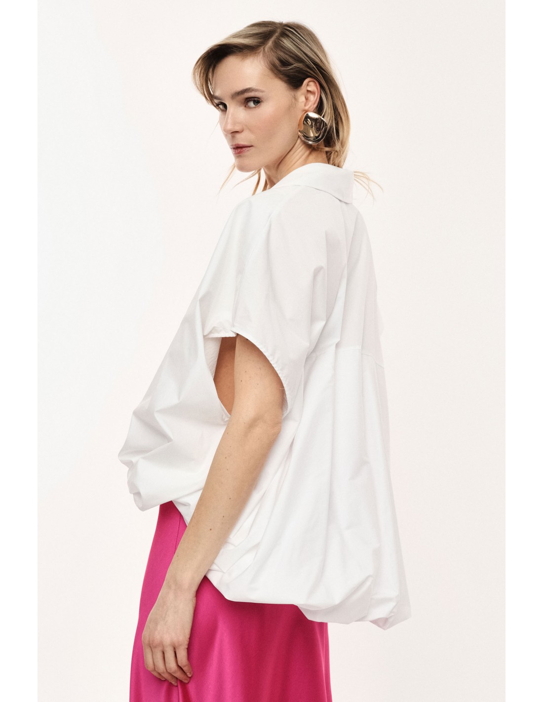 Chemisier oversized sans manches signature Imperial Fashion : forme boule asymétrique avec dos plus long et ourlet élastiqué pour un volume mode maîtrisé. Col pointe et décolleté poitrine pour équilibrer la silhouette. Popeline de coton, fabrication italienne. Livraison express 24/48h, paiement fractionné, accompagnement styling expert. Retours et échanges possibles — retour à la charge du client. Emballage soigné.