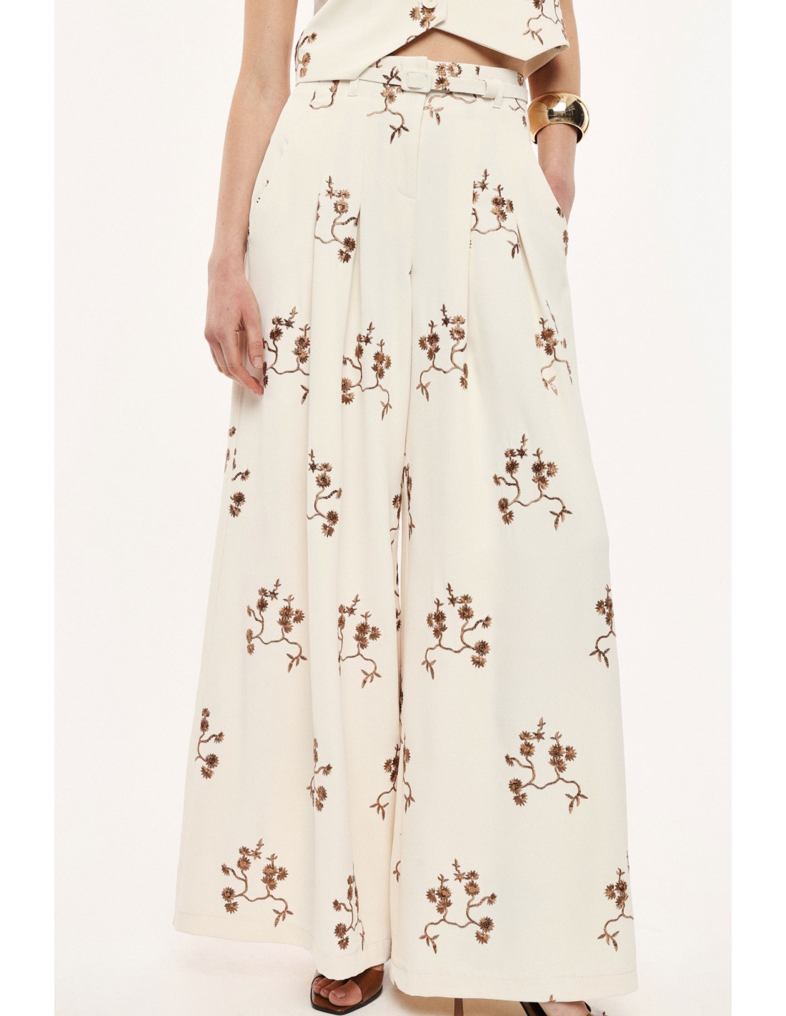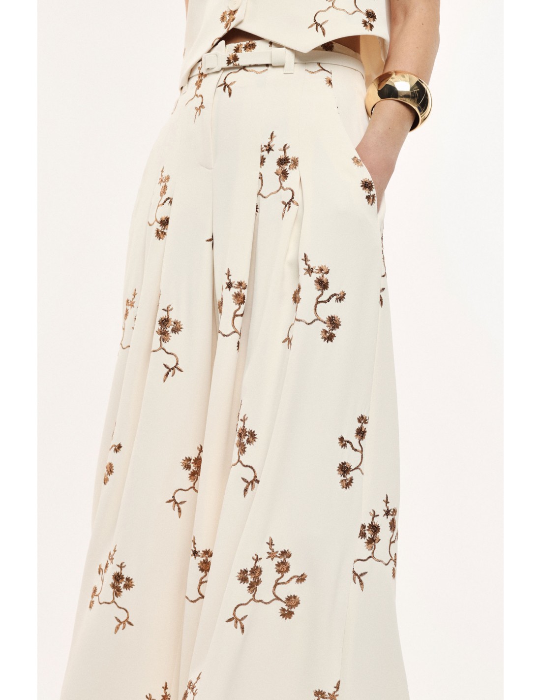 Le modèle se distingue par son motif fleuri brodé enrichi de sequins cuivrés, qui capte la lumière sans excès et donne une dimension couture à la pièce. Les plis profonds et la ceinture assortie fournie renforcent la structure visuelle du pantalon et facilitent le styling.