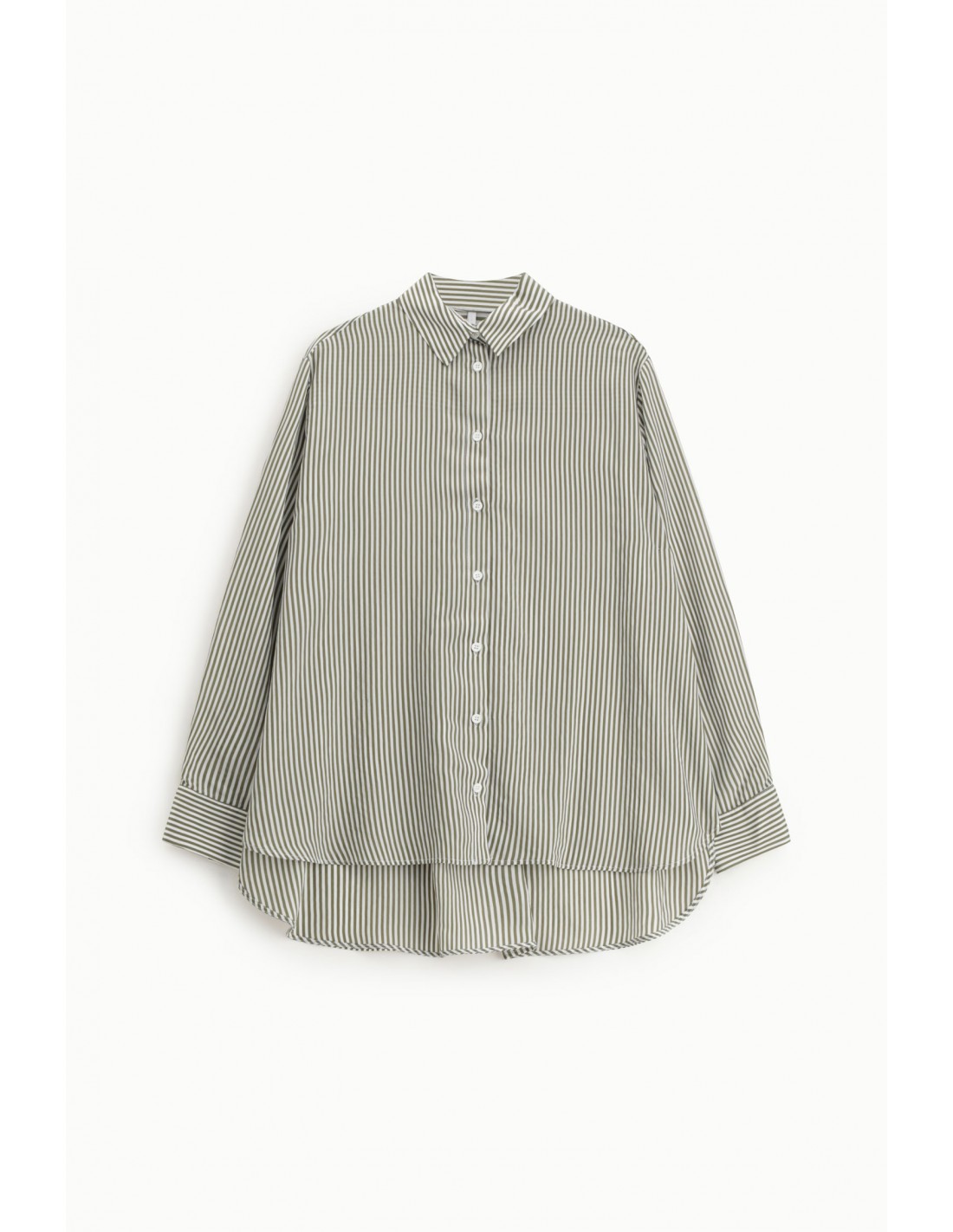 La coupe oversized est volontairement maîtrisée pour conserver une ligne nette et féminine. Le col pointe souple et les manches longues à poignets boutonnés apportent une structure subtile, tandis que l’asymétrie avec dos plus long dynamise la silhouette et allonge la ligne.