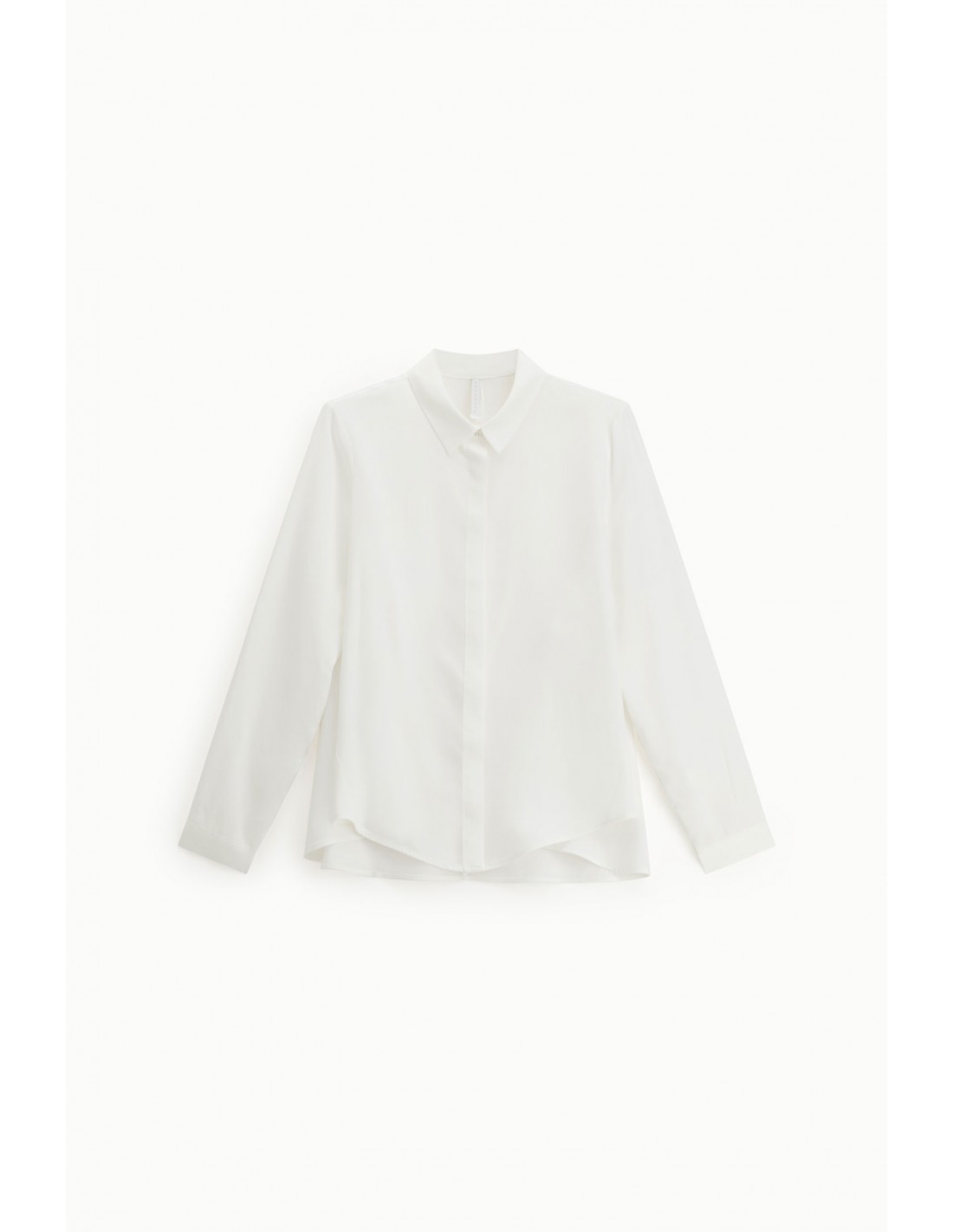 Chemise basique du vestiaire Imperial, pensée pour être portée souvent et rachetée dans plusieurs coloris. Coupe droite à forme trapèze marquée, fluide et flatteuse, facile à vivre au quotidien. Col pointe classique, manches longues et ourlet asymétrique pour varier les portés, rentré, semi-rentré ou fluide. Une pièce essentielle, élégante sans effort, qui fonctionne aussi bien au travail qu’en usage plus casual. Taille normalement. Fabrication italienne.