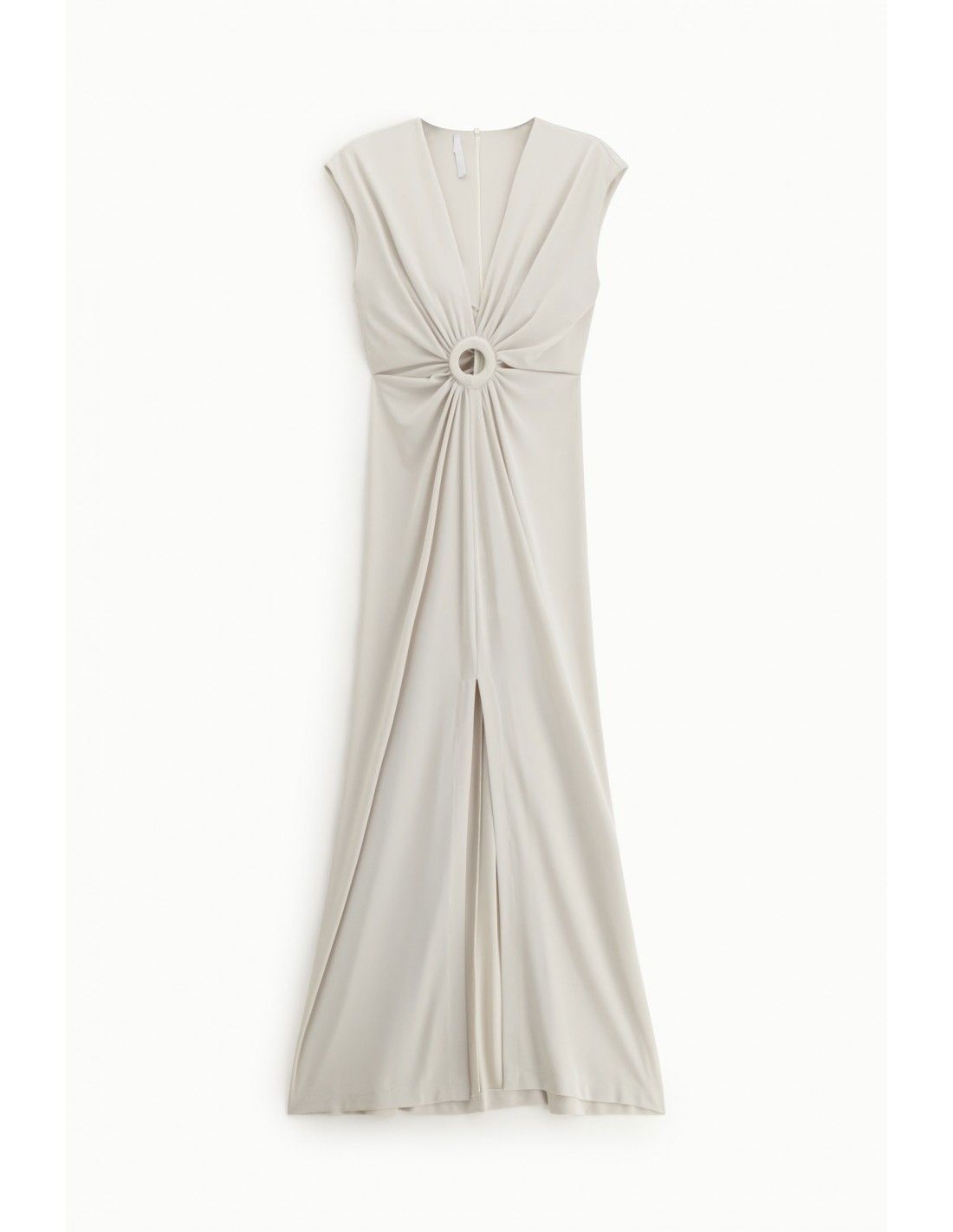 Le décolleté plongeant en V met en valeur la poitrine et s’accompagne d’un drapé sophistiqué, structuré autour d’un anneau capitonné placé sous la poitrine. Ce détail crée un point focal élégant et donne toute son identité à la robe. Le drapé se prolonge au dos, apportant équilibre et continuité visuelle.