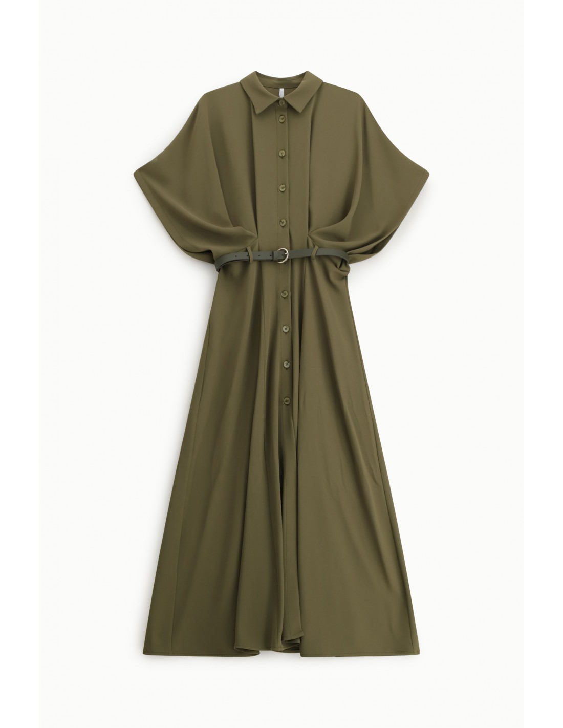Robe chemise longue Imperial à la silhouette élégante et facile à porter. Forme droite structurée par des pinces qui marquent subtilement la taille, complétée par une ceinture fournie à passer dans les passants cousus. Col pointe souple, manches kimono et boutonnage intégral pour une allure fluide et féminine. Confectionnée dans un crêpe fluide à belle tenue, confortable au quotidien. Taille normalement. Fabrication italienne.