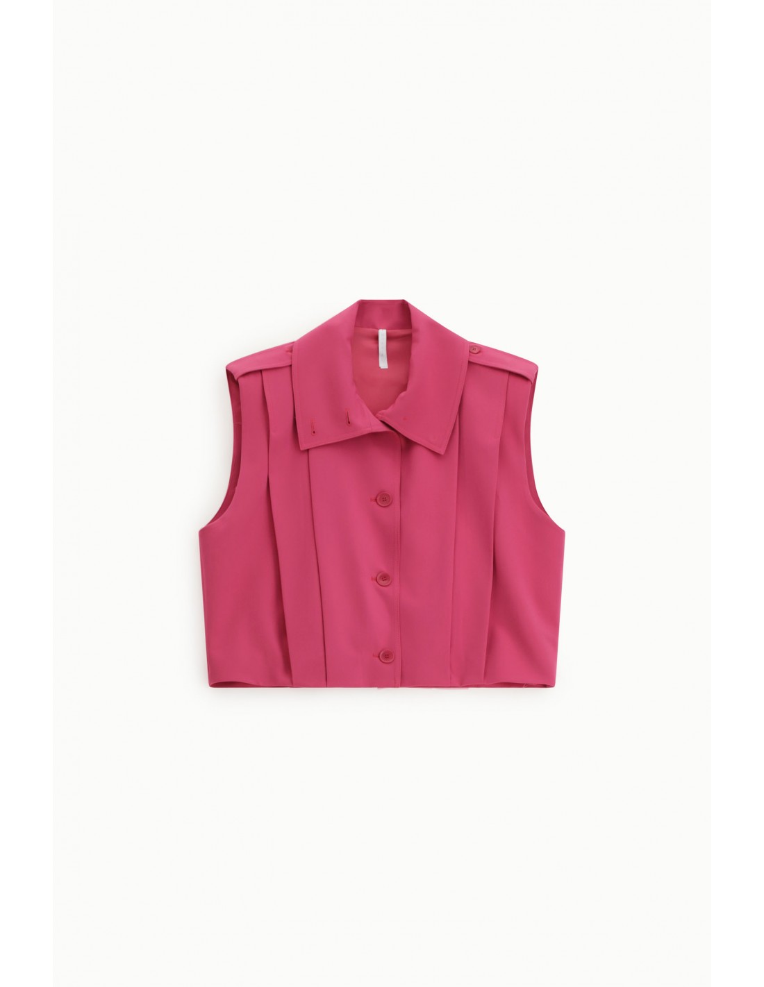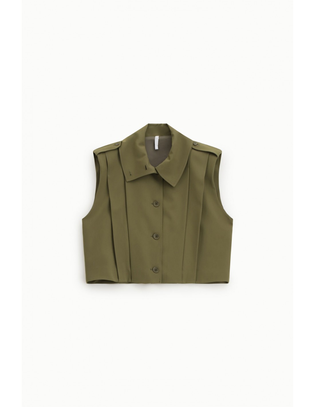 Veste sans manches Imperial à l’allure couture, pensée pour structurer une silhouette contemporaine. Coupe oversized affirmée, col montant graphique, fermeture boutonnée et épaulettes boutonnées pour une ligne forte. Les soufflets placés à l’avant et au dos apportent du volume et du mouvement, tandis que la draperie sergée assure une tenue élégante. Entièrement doublée. Une pièce signature à associer avec toutes les créations coupées dans la même draperie. Fabrication italienne.