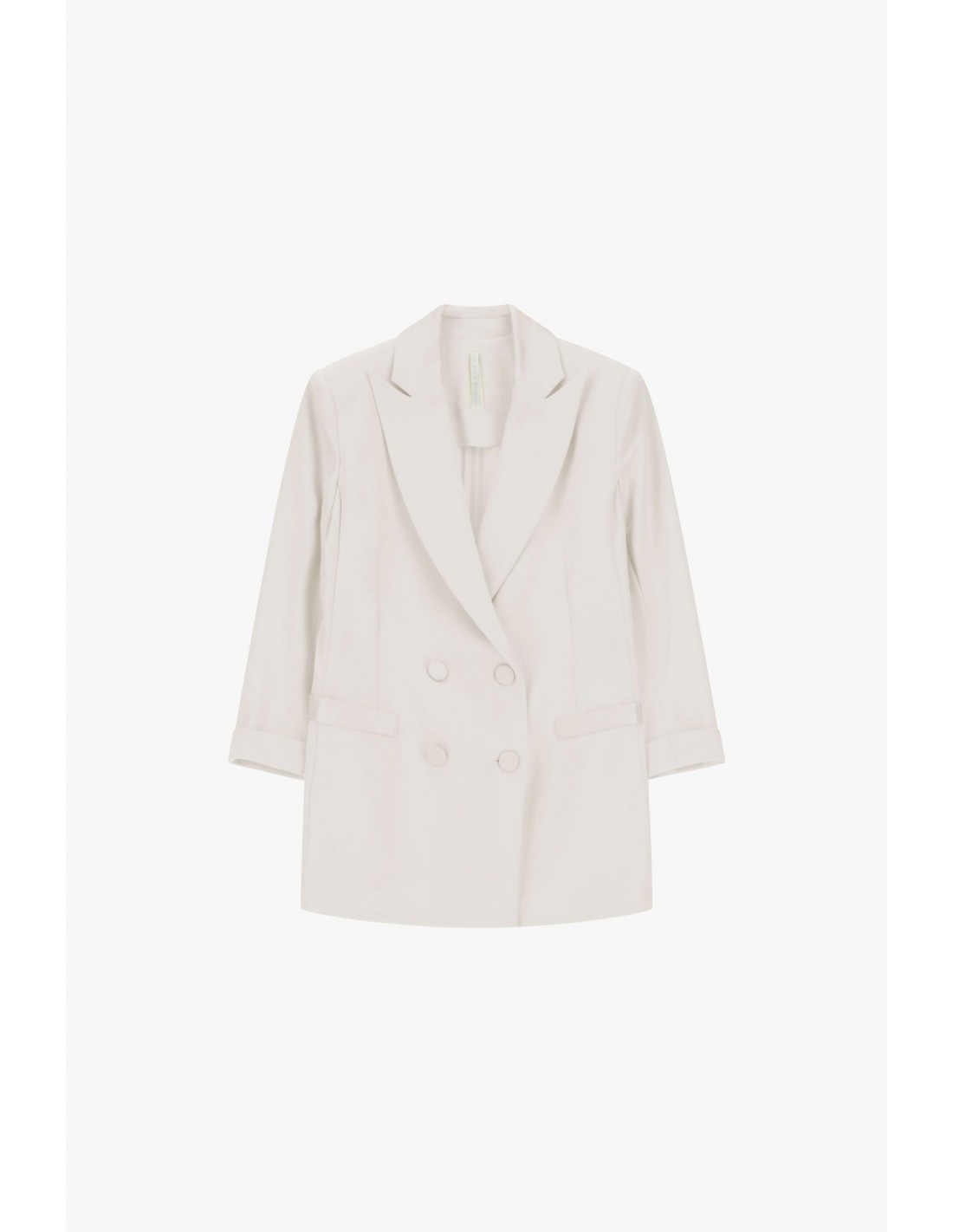 Ce blazer de smoking est la pièce centrale du tailleur cérémonie Imperial. Sa forme légèrement appuyée structure la silhouette tout en conservant une grande fluidité, pour une allure élégante et affirmée. Le col à revers et crans en satin ton sur ton signe immédiatement l’esprit smoking, renforcé par le boutonnage croisé et les boutons capitonnés satin, véritables détails couture.