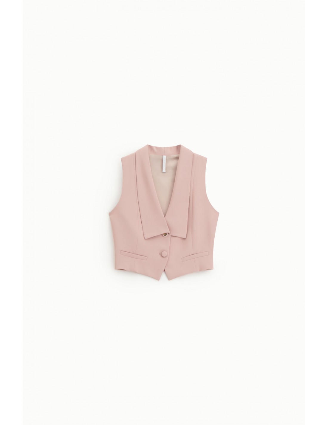 Ce gilet de tailleur court a été conçu pour structurer la silhouette tout en apportant une touche contemporaine au vestiaire tailoring. Sa longueur dos de 44 cm vient marquer la taille et créer un contraste élégant avec les pantalons à jambe large, notamment le palazzo assorti. Le col à revers larges et les pans droits apportent une allure nette et affirmée, inspirée du vestiaire masculin revisité.