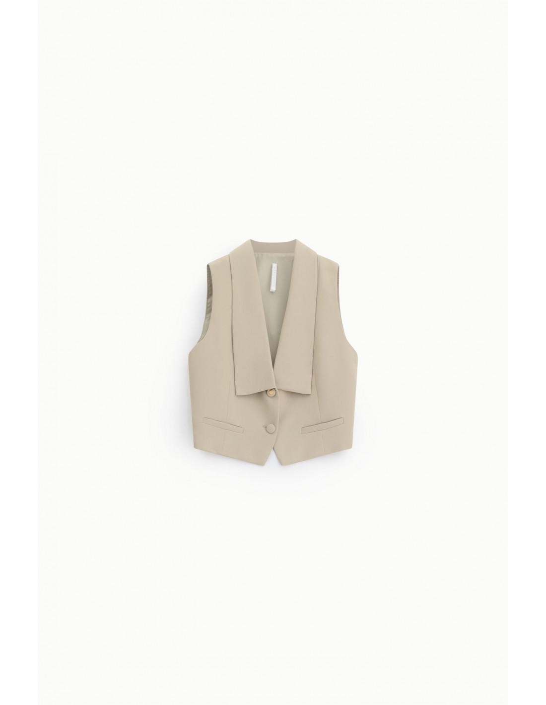 Ce gilet de tailleur court a été conçu pour structurer la silhouette tout en apportant une touche contemporaine au vestiaire tailoring. Sa longueur dos de 44 cm vient marquer la taille et créer un contraste élégant avec les pantalons à jambe large, notamment le palazzo assorti. Le col à revers larges et les pans droits apportent une allure nette et affirmée, inspirée du vestiaire masculin revisité.