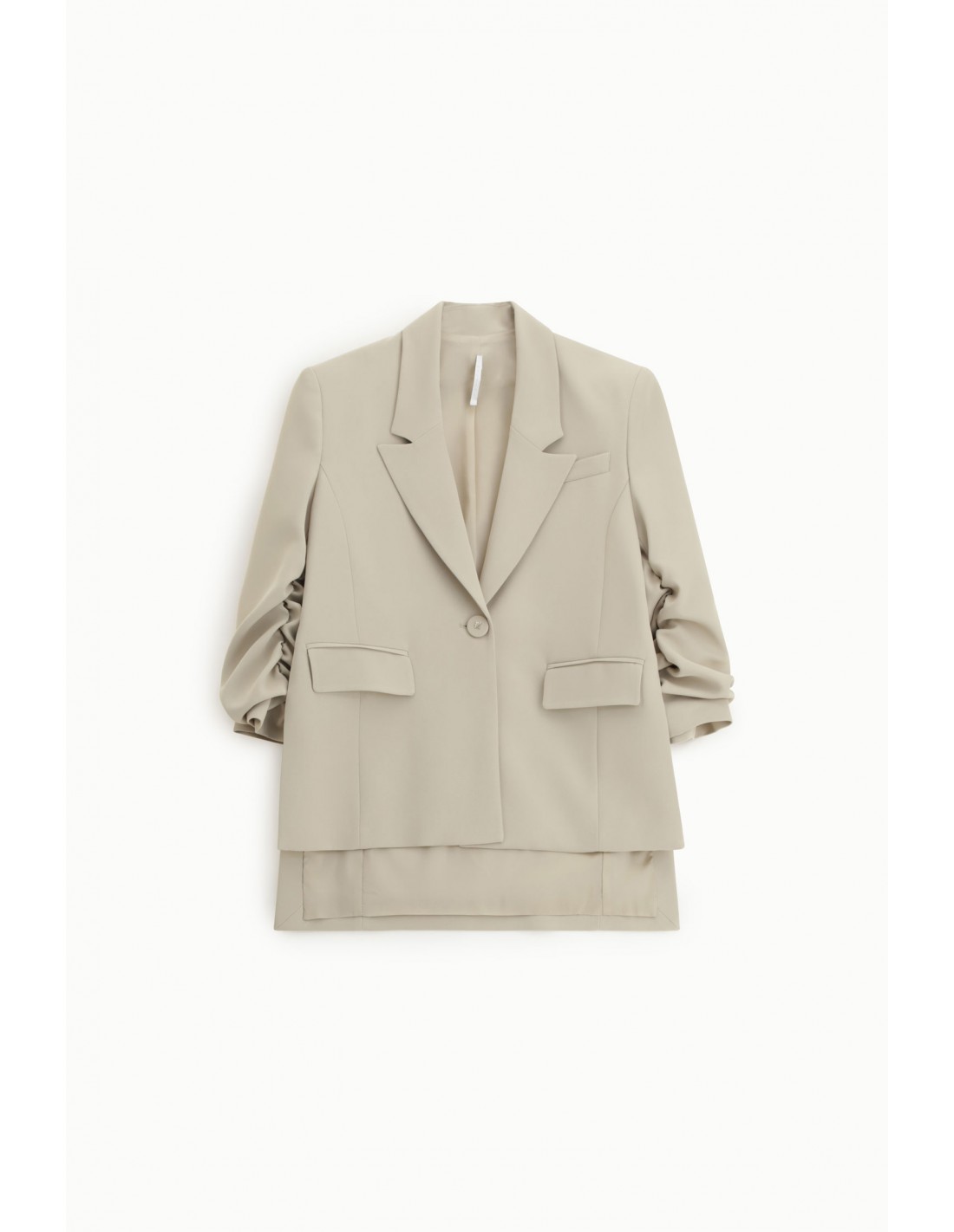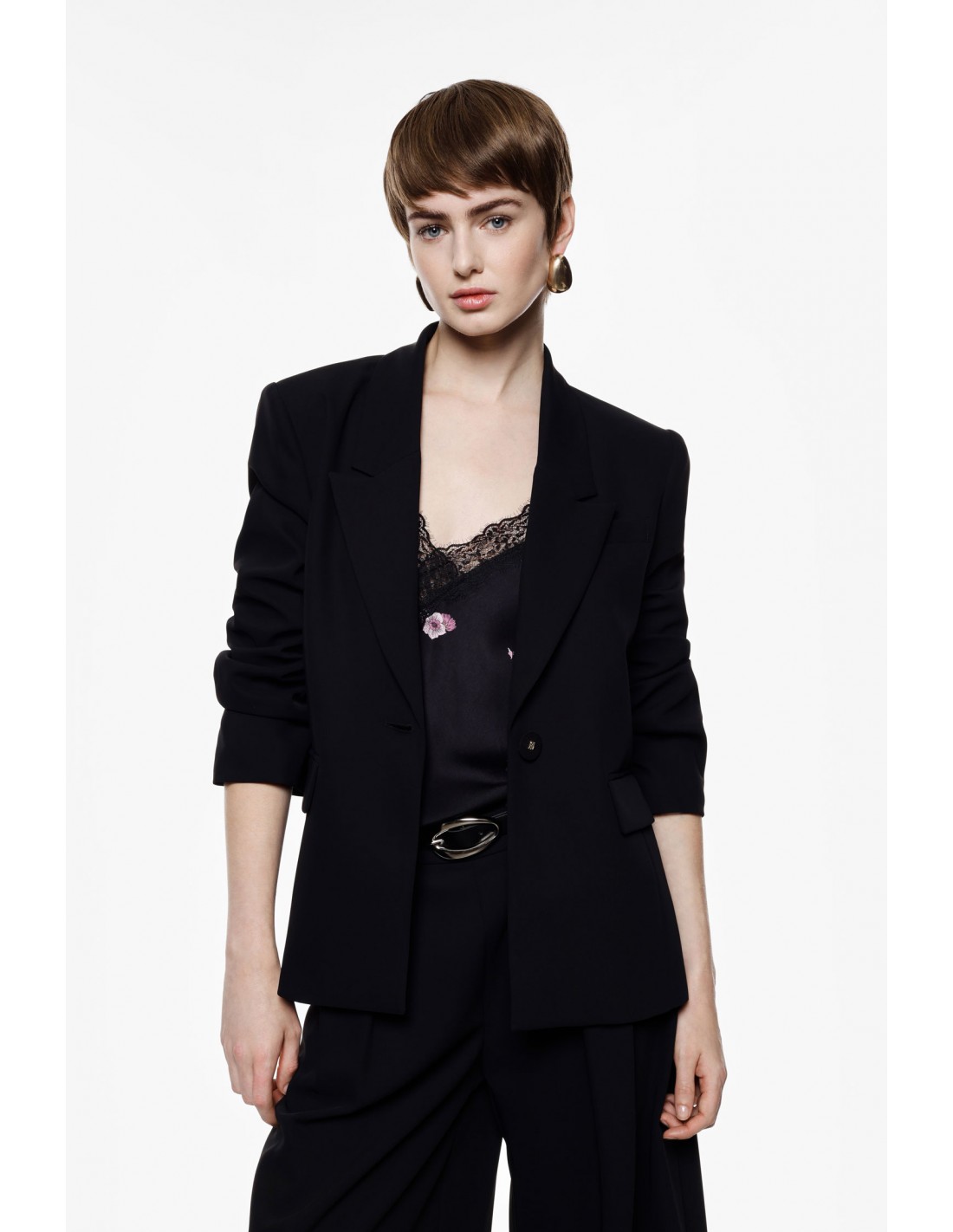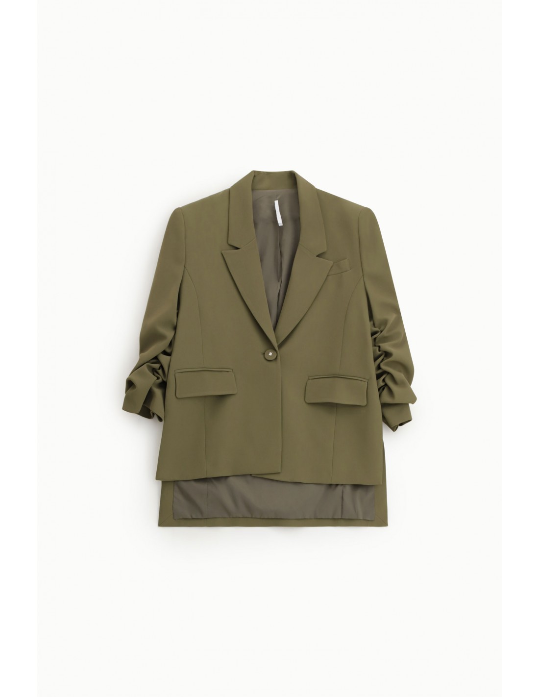 Ce blazer développe une silhouette droite legerement appuyée , structurée par une coupe droite et une tournure ajustée qui apportent du caractère sans rigidité. Le col à revers crantés et la fermeture par bouton inscrivent la pièce dans les codes du tailoring, tandis que les proportions contemporaines lui donnent une lecture résolument actuelle. Les manches 3/4 drapées accentuent la fluidité du modèle et dégagent le poignet pour une allure plus légère et féminine.