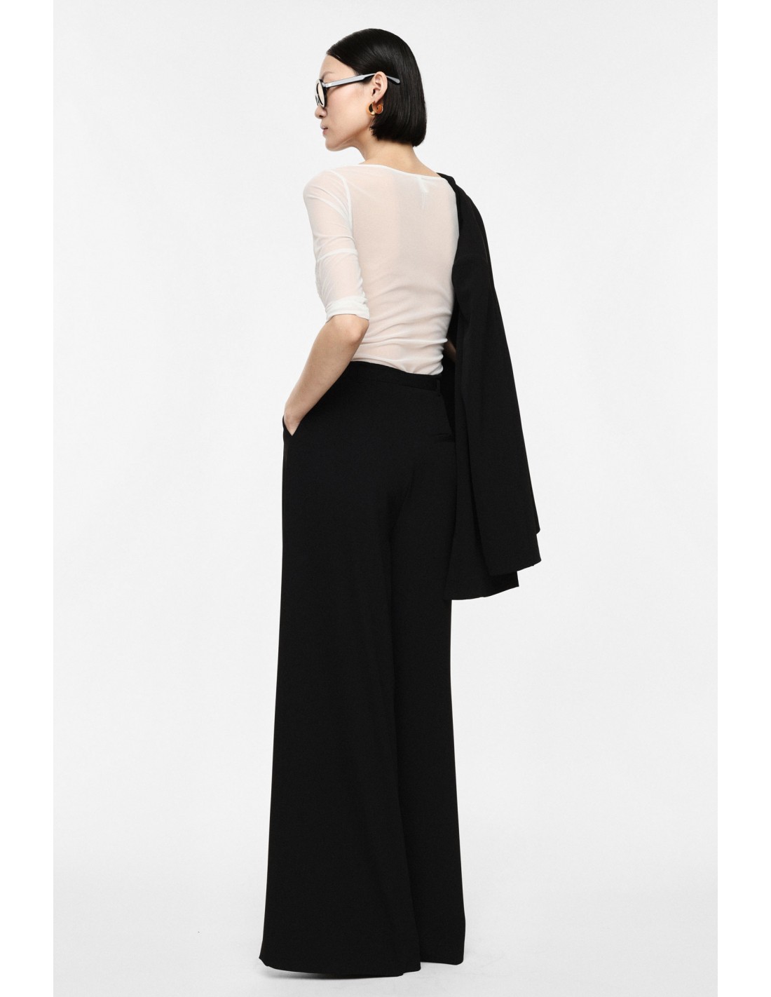 La coupe large est équilibrée par des plis avant qui créent du mouvement et renforcent la fluidité du tombé. Les poches italiennes à l’avant apportent une fonctionnalité discrète, tandis que la poche arrière à passepoil souligne l’inspiration tailoring du modèle. Le pantalon tombe avec élégance, offrant une allure élancée et maîtrisée.