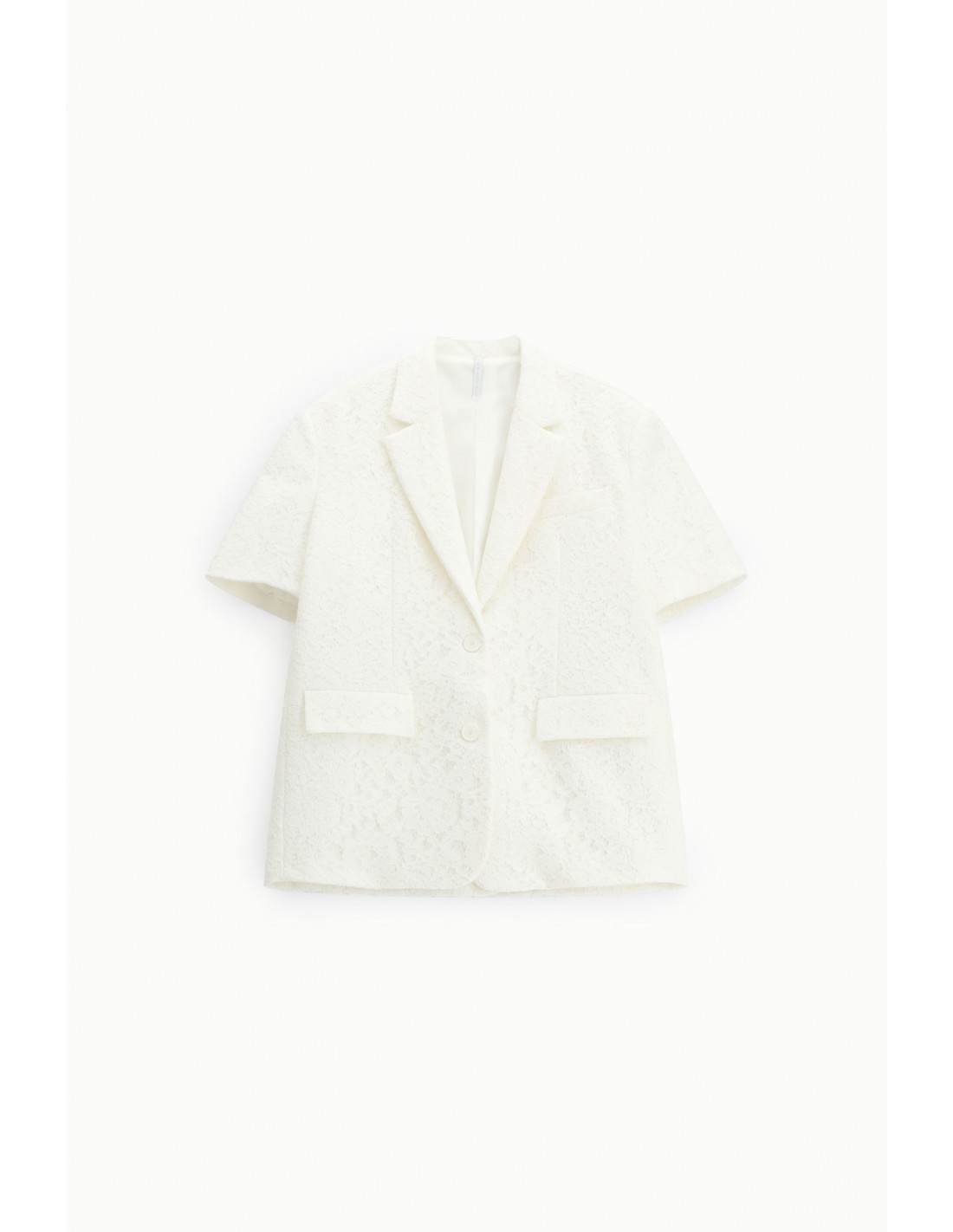 Le col à revers et crans apporte la structure et l’écriture “tailleur”, tandis que les manches courtes modernisent la pièce et permettent de l’adapter à plusieurs contextes, du look événementiel à une silhouette plus quotidienne. La fente milieu dos accompagne le mouvement et améliore l’aisance au porté. La doublure intégrale assure un rendu net, confortable, et met en valeur le travail de la dentelle sans transparence non maîtrisée.