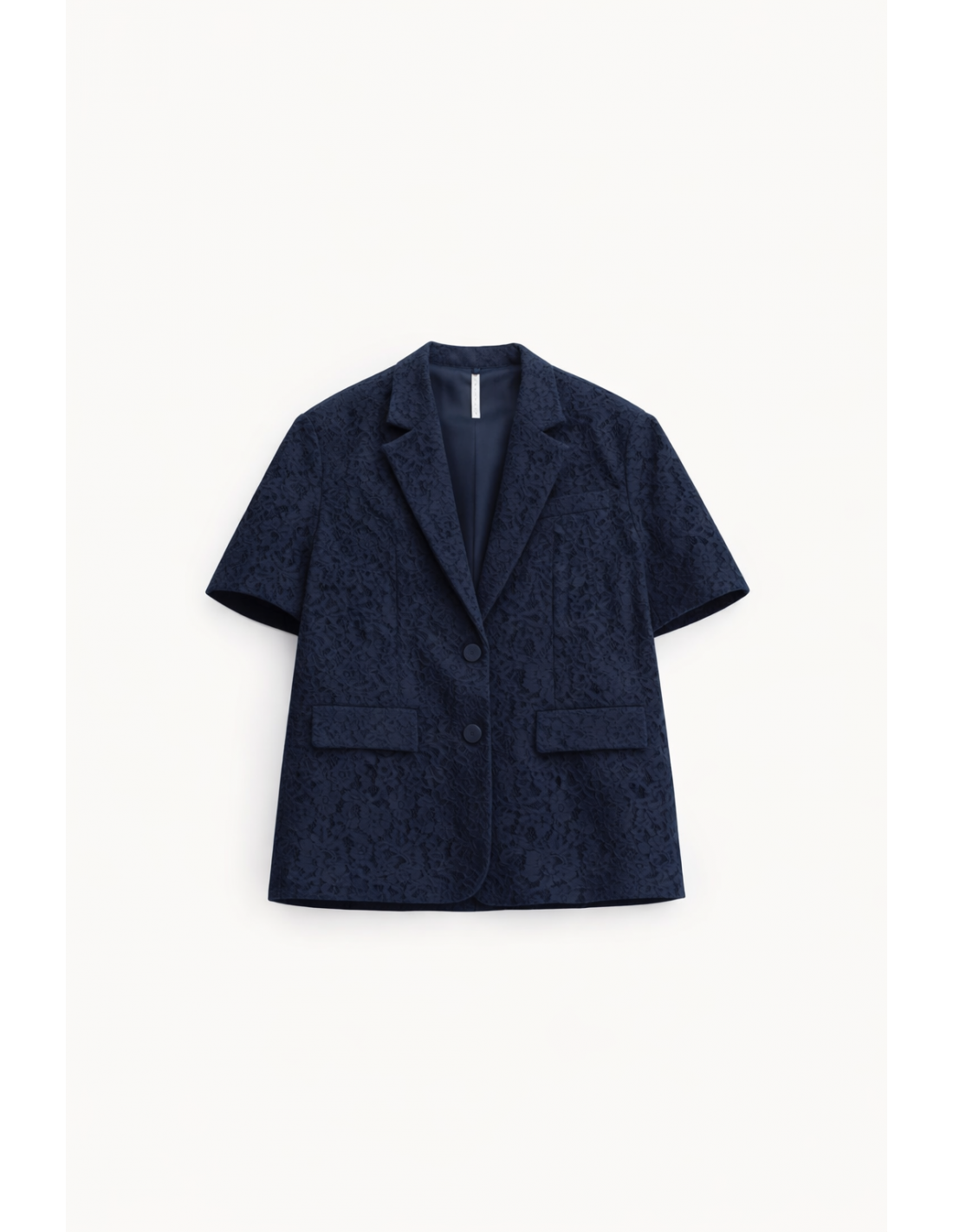 Le col à revers et crans apporte la structure et l’écriture “tailleur”, tandis que les manches courtes modernisent la pièce et permettent de l’adapter à plusieurs contextes, du look événementiel à une silhouette plus quotidienne. La fente milieu dos accompagne le mouvement et améliore l’aisance au porté. La doublure intégrale assure un rendu net, confortable, et met en valeur le travail de la dentelle sans transparence non maîtrisée.