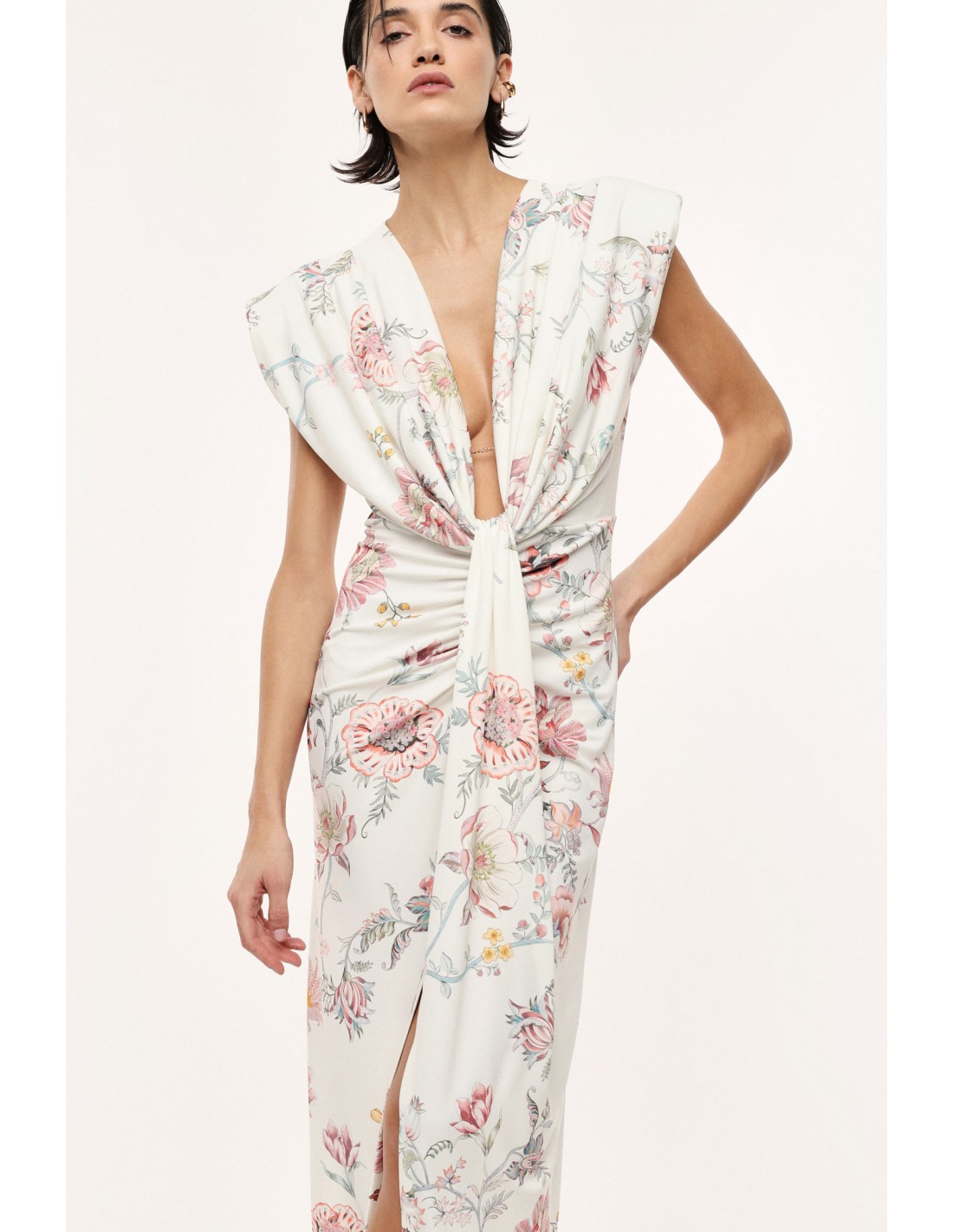 Le décolleté plongeant en V met en valeur le port de tête et les épaules, renforcé par une construction sans manches qui apporte une allure épurée et contemporaine. Le drapé central structure visuellement la robe et affine la ligne, créant un équilibre parfait entre féminité et modernité.