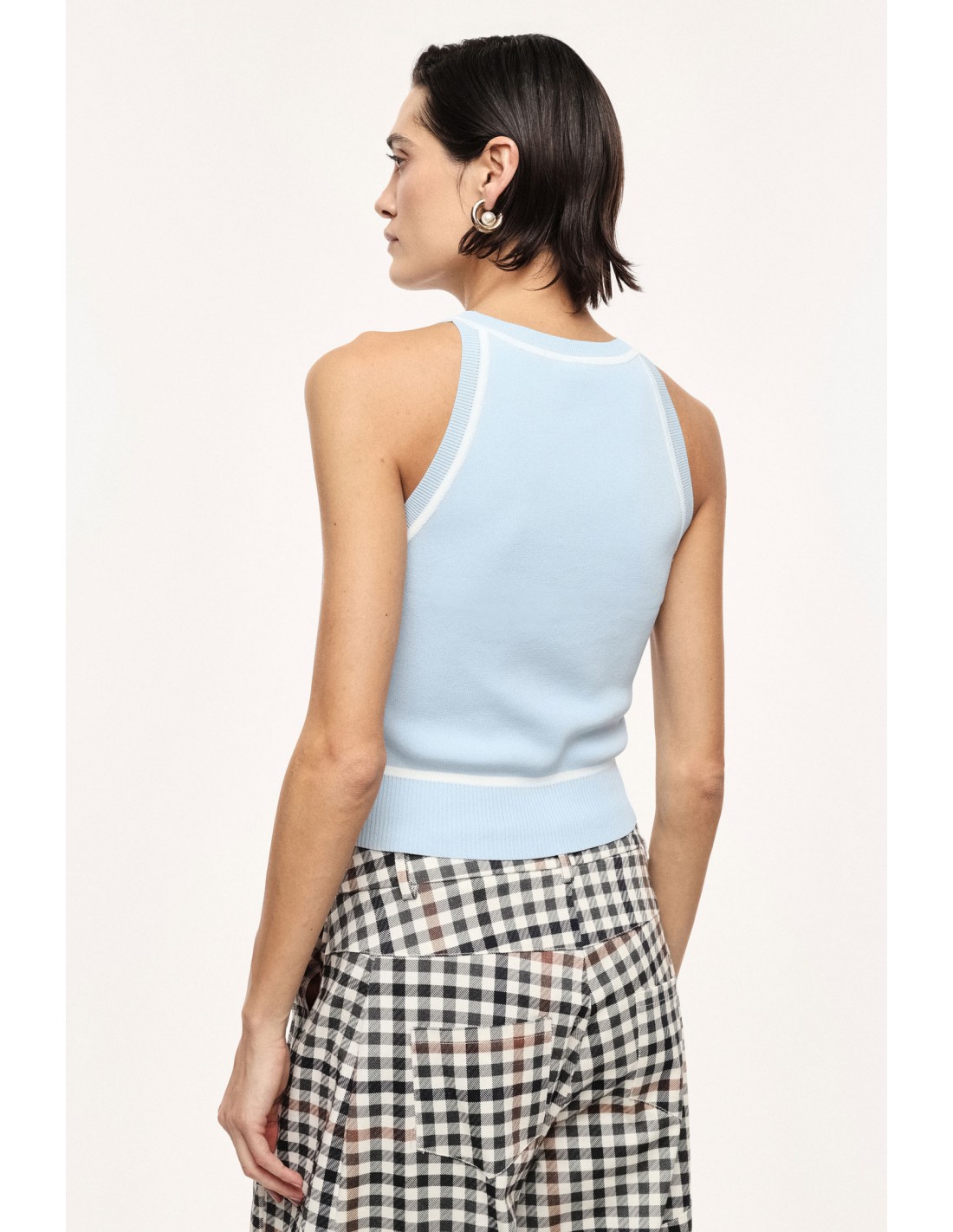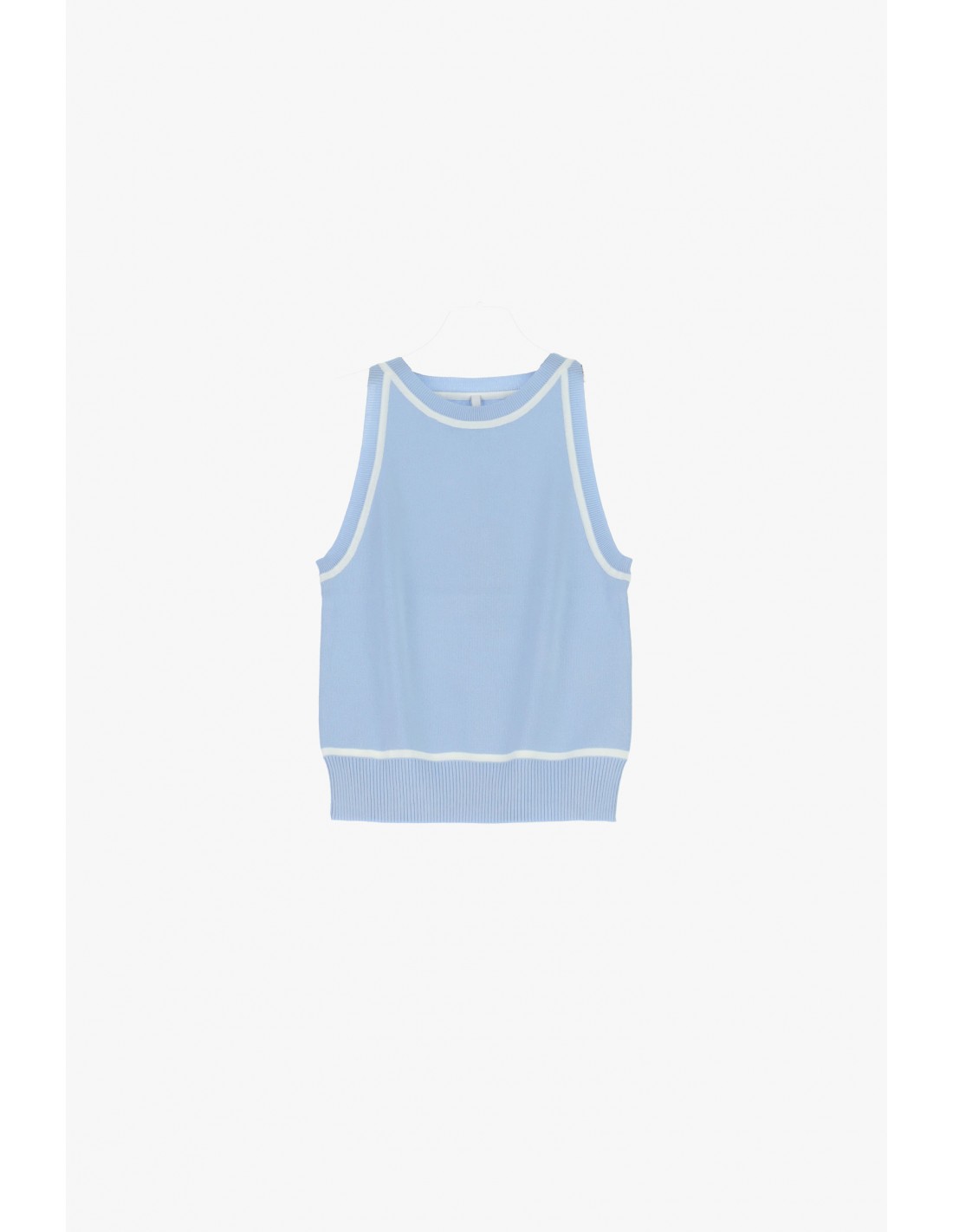Ce top sans manches Imperial séduit par sa simplicité maîtrisée et son esthétique contemporaine. Sa coupe régulière assure un porté naturel, tandis que le col rond met en valeur le haut du buste avec sobriété. Les bordures contrastées viennent souligner la ligne du vêtement et apportent un détail graphique discret, parfaitement intégré à l’ensemble.
