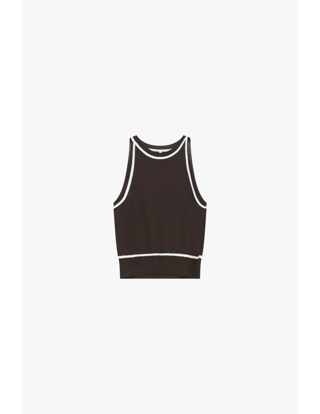 Ce top sans manches Imperial séduit par sa simplicité maîtrisée et son esthétique contemporaine. Sa coupe régulière assure un porté naturel, tandis que le col rond met en valeur le haut du buste avec sobriété. Les bordures contrastées viennent souligner la ligne du vêtement et apportent un détail graphique discret, parfaitement intégré à l’ensemble.