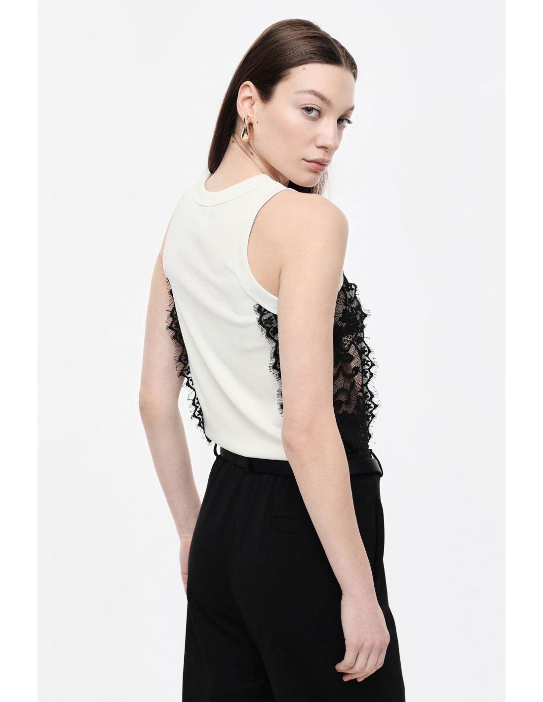 Pensé pour favoriser les superpositions et les associations modernes, il s’intègre facilement dans un look structuré sous un blazer ou un gilet tailleur, mais fonctionne tout aussi bien porté seul avec un pantalon fluide, un denim ou une jupe. La dentelle latérale crée un équilibre entre sobriété et féminité, rendant la pièce adaptable du quotidien à des tenues plus habillées.