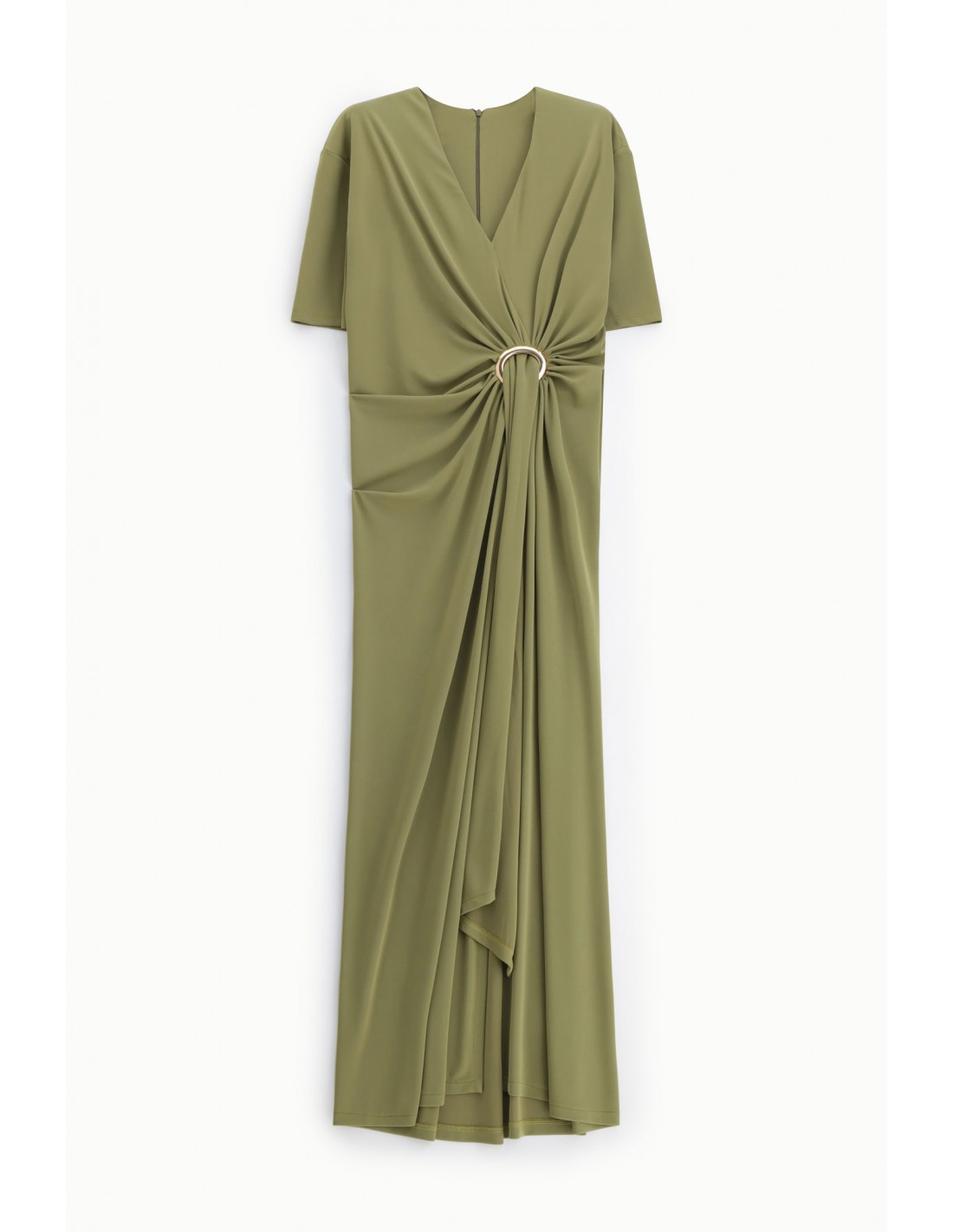 Robe longue Imperial Femme à silhouette fluide et élégante, structurée par un nœud frontal et un anneau décoratif doré à la taille. Une pièce forte, pensée pour sublimer la silhouette lors d’événements habillés comme dans un cadre urbain chic.