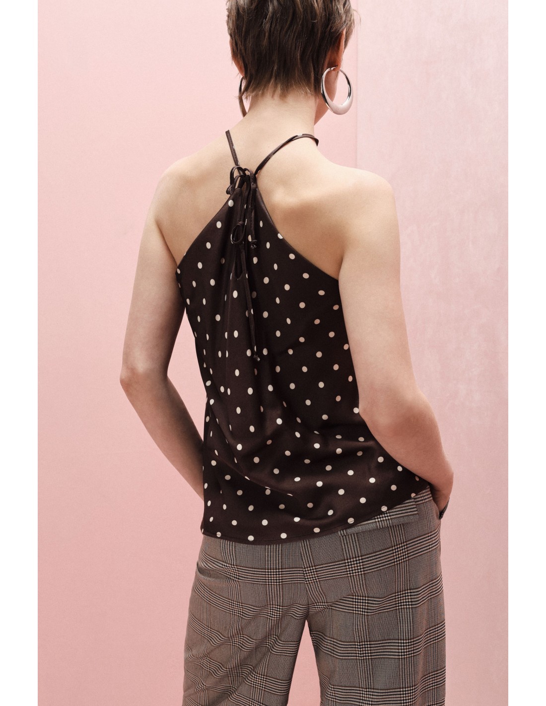 Un top pensé pour compléter une silhouette élégante sans effort. Son encolure américaine met en valeur les épaules tandis que les fines bretelles apportent de la légèreté. Le fond chocolat ponctué de pois beige donne du caractère tout en restant facile à associer.
