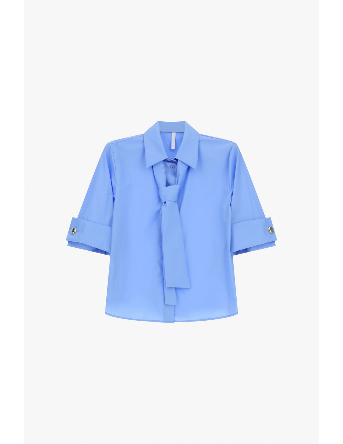 Chemisier en popeline de coton à l’esprit tailoring moderne. Sa coupe droite fluide structure la silhouette sans la contraindre tandis que les manches longueur coude retroussées, maintenues par un large revers boutonné et des boutons métalliques décoratifs, apportent un relief discret immédiatement visible.