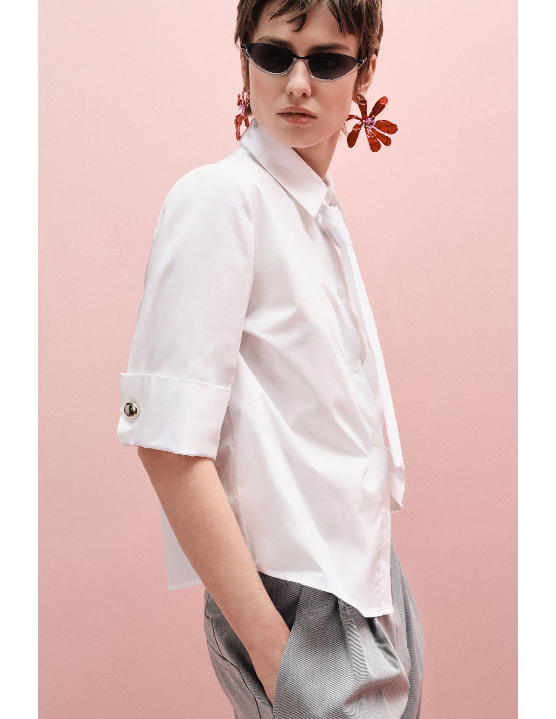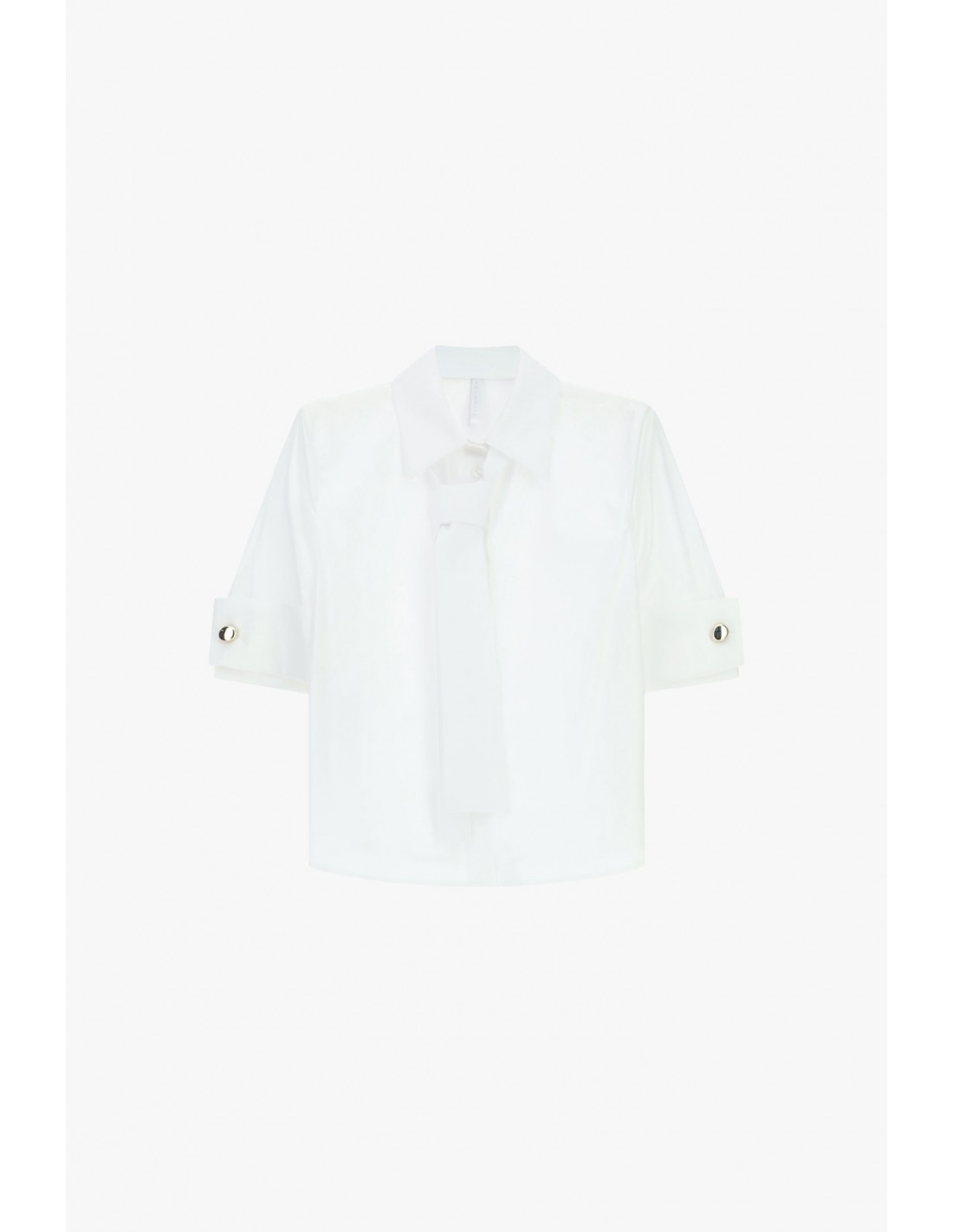 Chemisier en popeline de coton à l’esprit tailoring moderne. Sa coupe droite fluide structure la silhouette sans la contraindre tandis que les manches longueur coude retroussées, maintenues par un large revers boutonné et des boutons métalliques décoratifs, apportent un relief discret immédiatement visible.