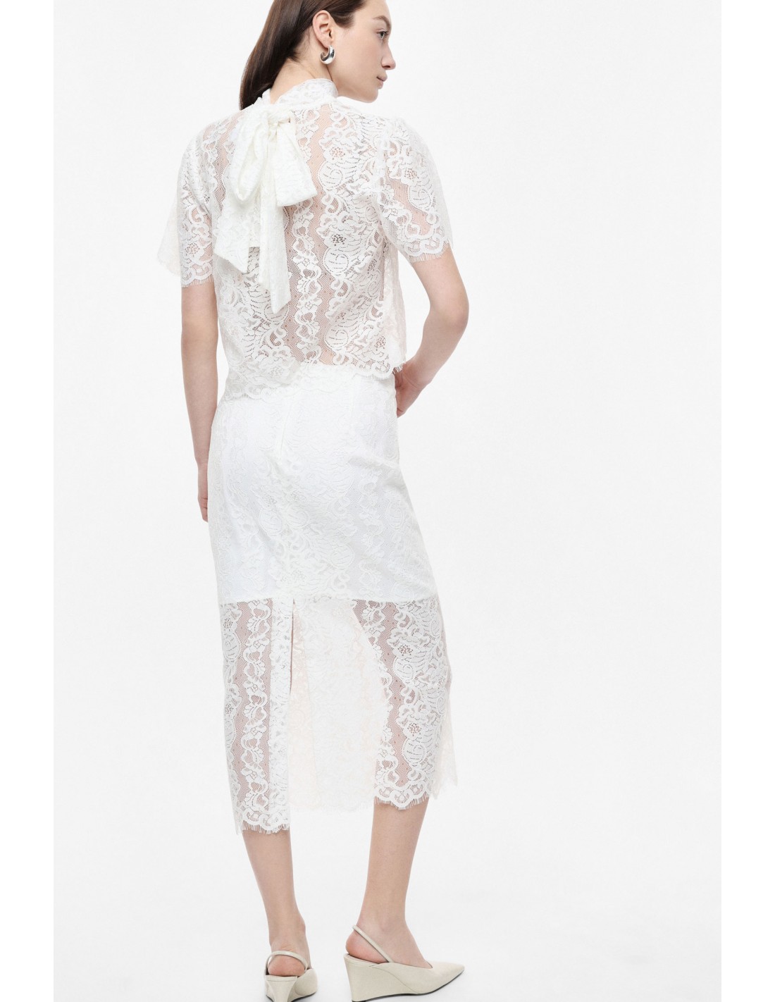 Jupe midi crayon en dentelle florale, longueur genou, avec fente latérale et bord festonné. Doublure mi-cuisse pour jouer la transparence sur le bas et créer une silhouette élégante mais moderne.