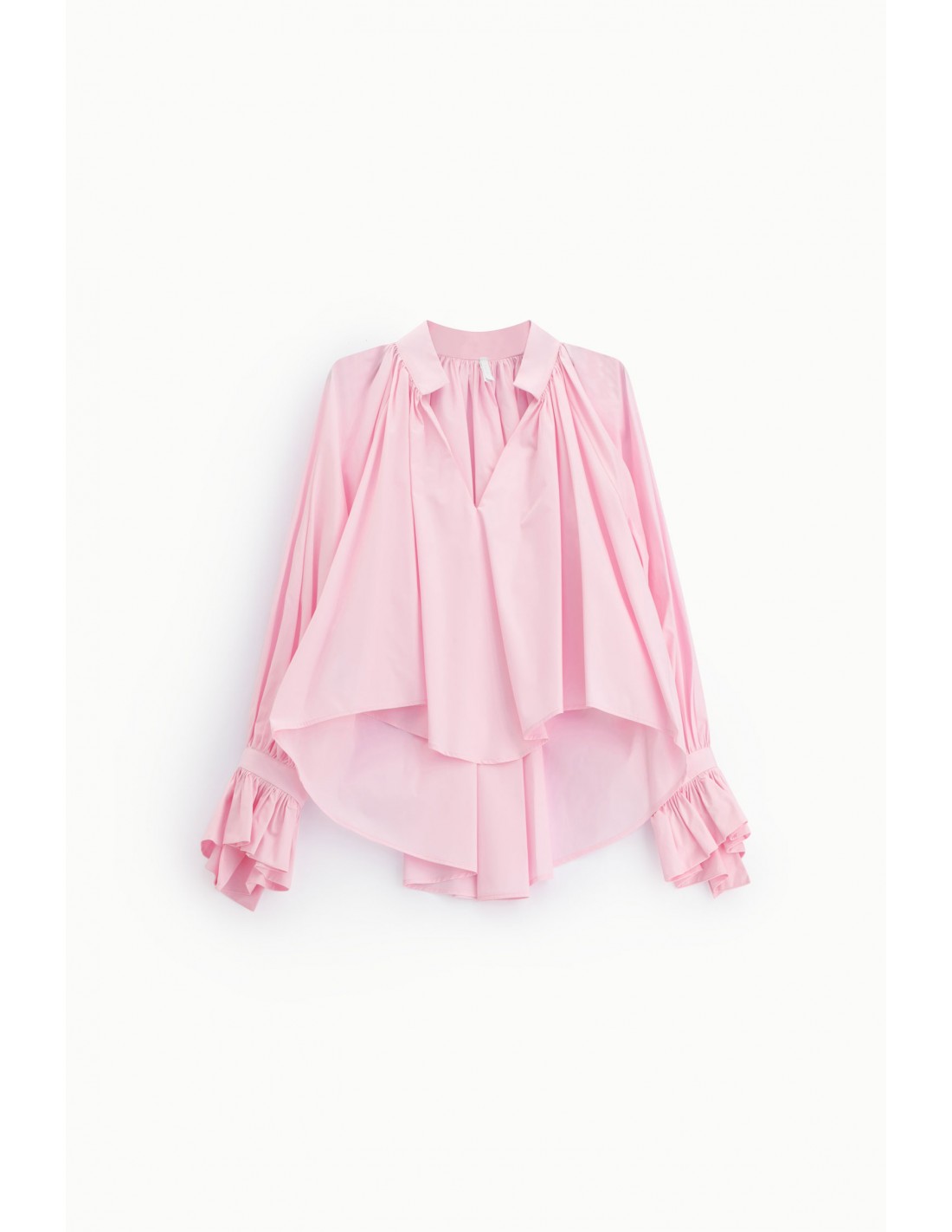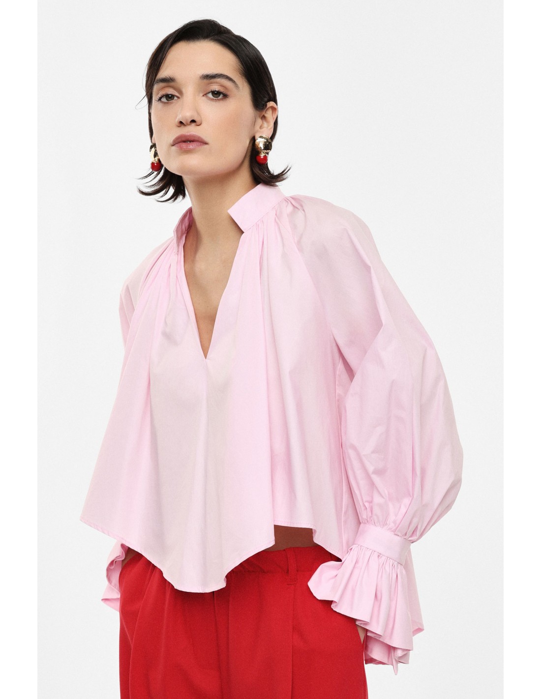 Volume ample, col officier structuré et manches ballon à poignets volantés pour créer immédiatement une silhouette construite sans rigidité.