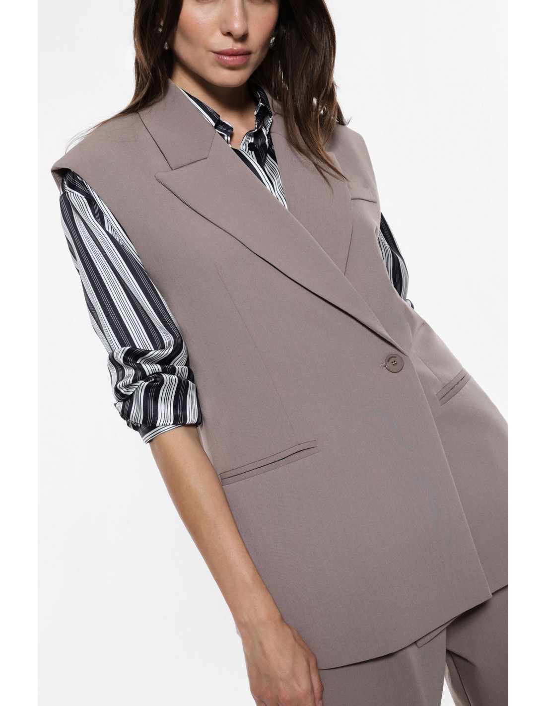 Ce blazer long sans manches Imperial Femme impose une présence forte grâce à sa coupe oversize et sa construction précise. Le col à revers larges structure immédiatement la carrure, tandis que la fermeture asymétrique à un bouton modernise la ligne.