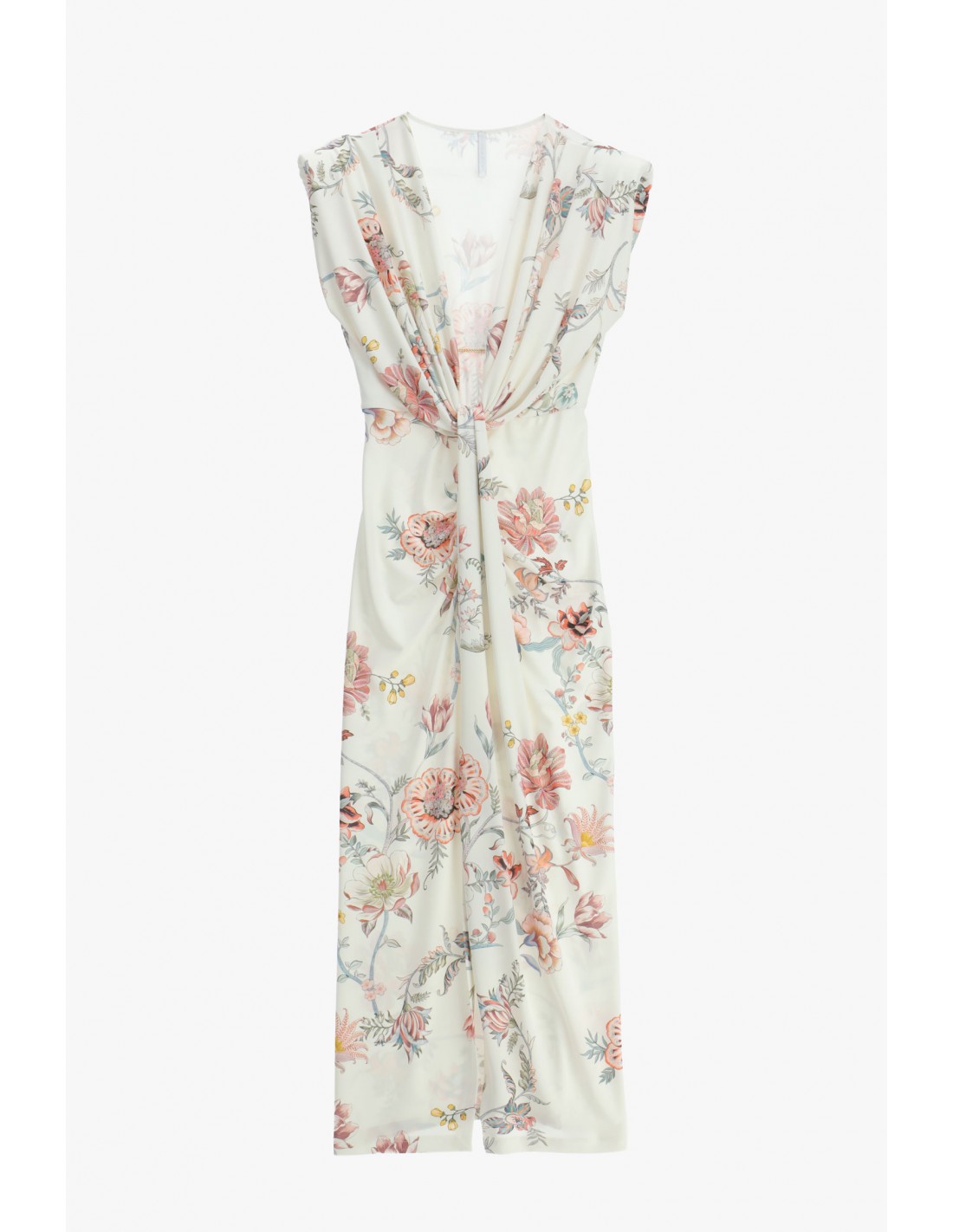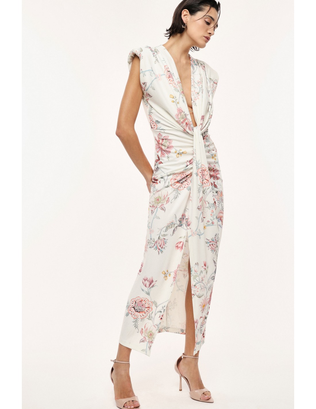 Le décolleté plongeant en V met en valeur le port de tête et les épaules, renforcé par une construction sans manches qui apporte une allure épurée et contemporaine. Le drapé central structure visuellement la robe et affine la ligne, créant un équilibre parfait entre féminité et modernité.