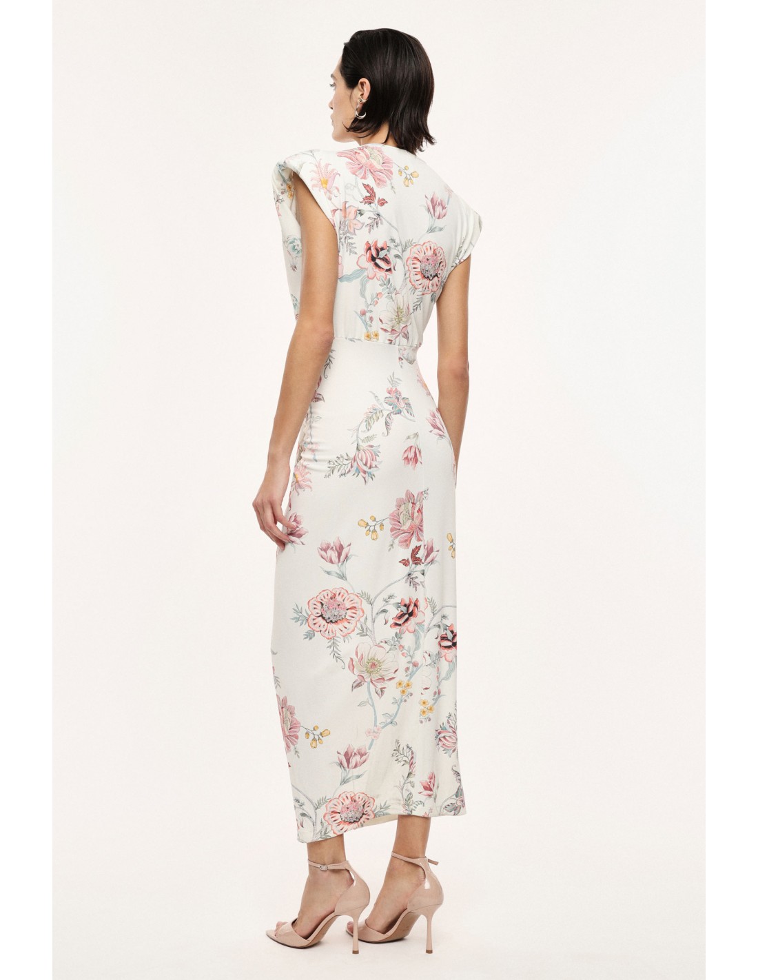 Le motif floral intégral, délicatement imprimé sur un fond écru lumineux, confère à la pièce une présence élégante sans excès, facile à accessoiriser selon l’occasion.