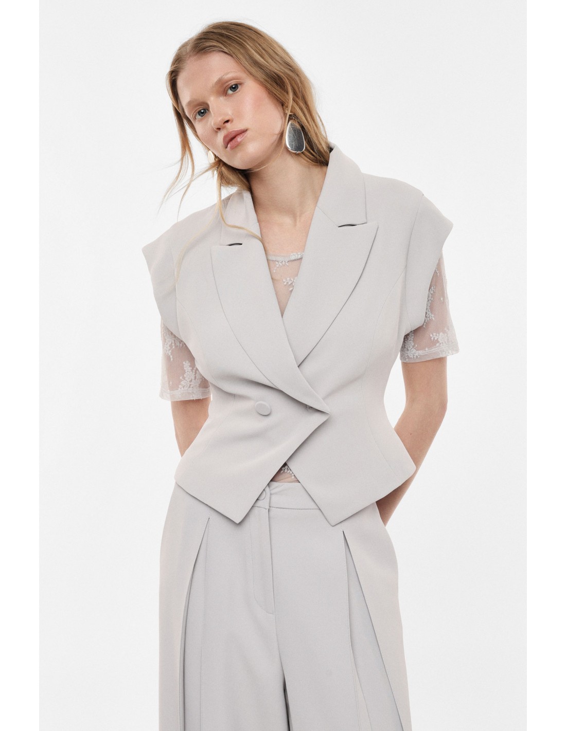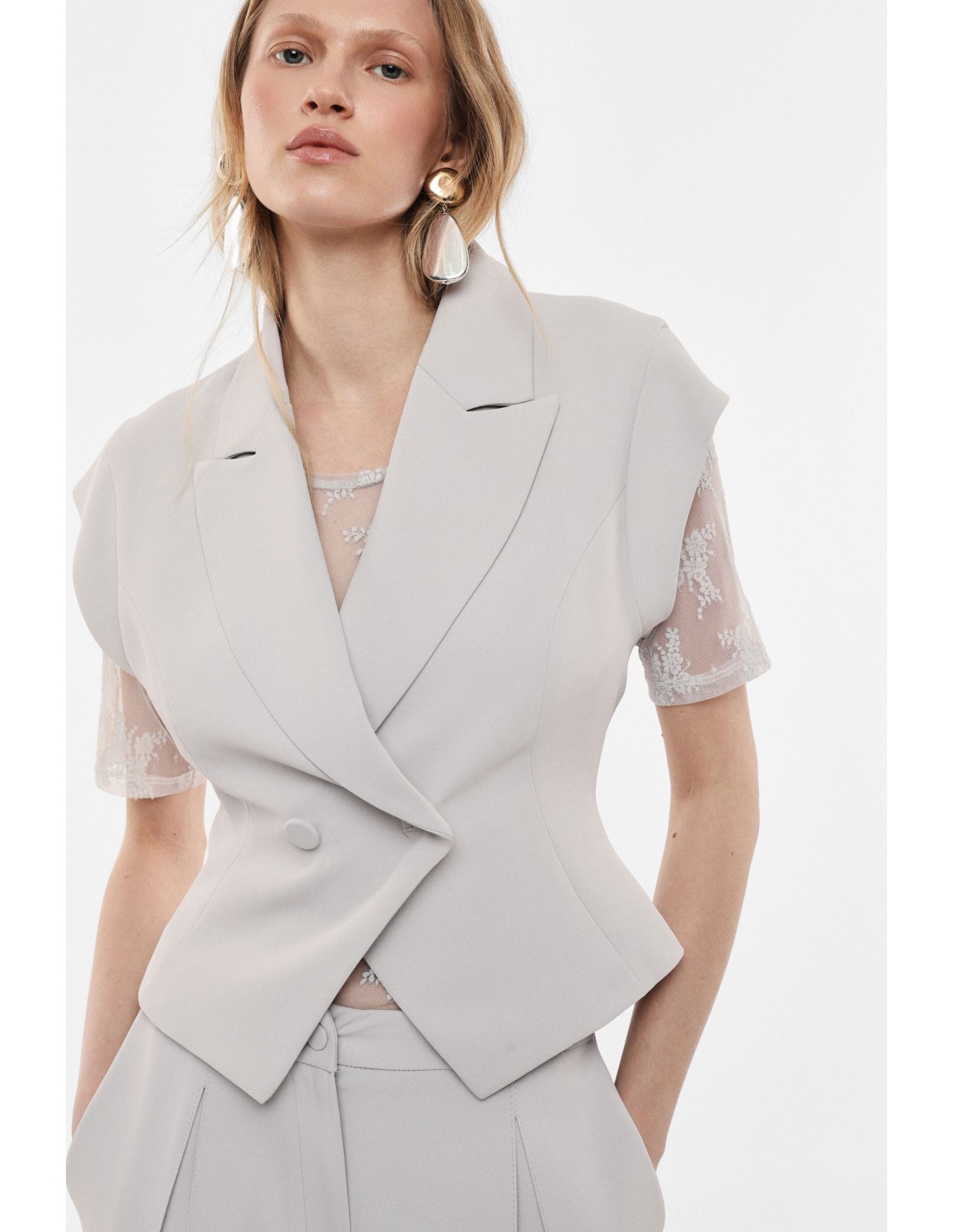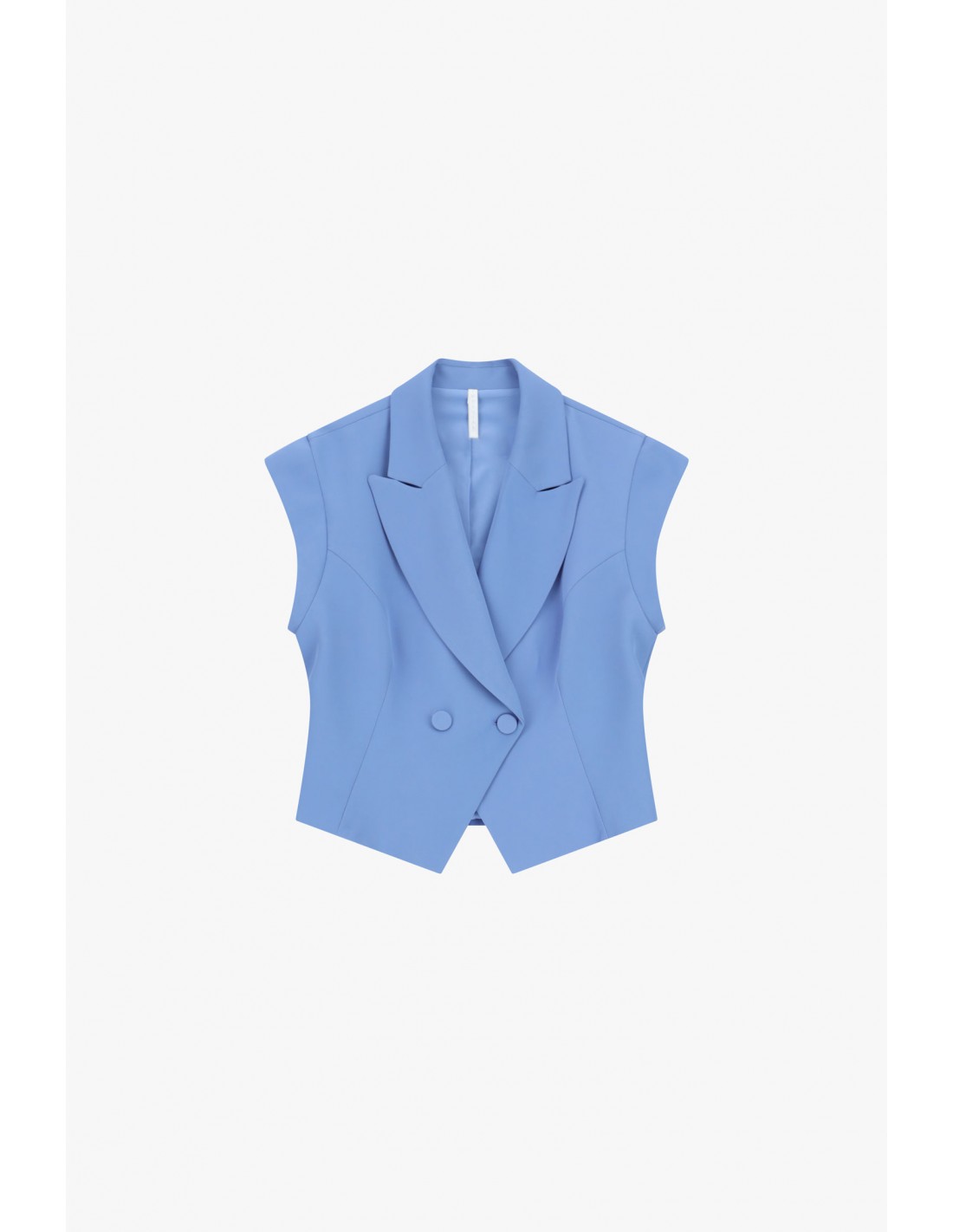 La coupe structurée met en valeur la ligne du buste tandis que le large col à revers apporte une dimension tailoring très marquée. La fermeture croisée à double bouton rappelle les codes du blazer classique tout en conservant la légèreté et la liberté de mouvement propres à une pièce sans manches.