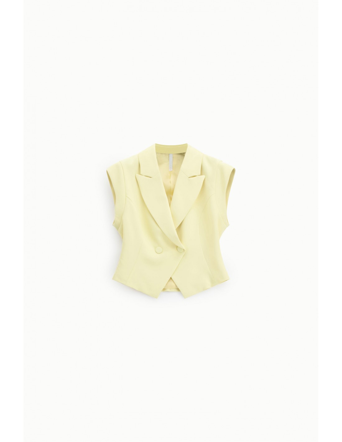 La coupe structurée met en valeur la ligne du buste tandis que le large col à revers apporte une dimension tailoring très marquée. La fermeture croisée à double bouton rappelle les codes du blazer classique tout en conservant la légèreté et la liberté de mouvement propres à une pièce sans manches.