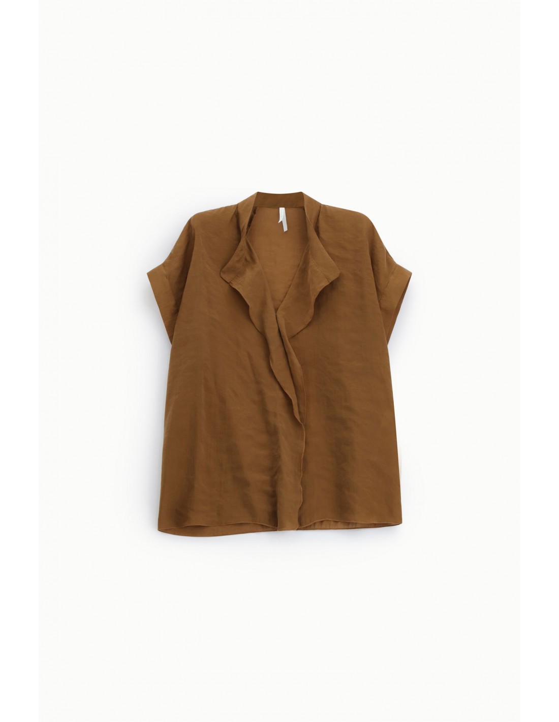 Le col châle, sans boutons apparents, apporte une élégance naturelle et une touche sophistiquée sans effort. Le volant sur le devant vient animer la pièce avec délicatesse, créant du mouvement à chaque geste, tandis que les manches courtes larges renforcent l’allure contemporaine.