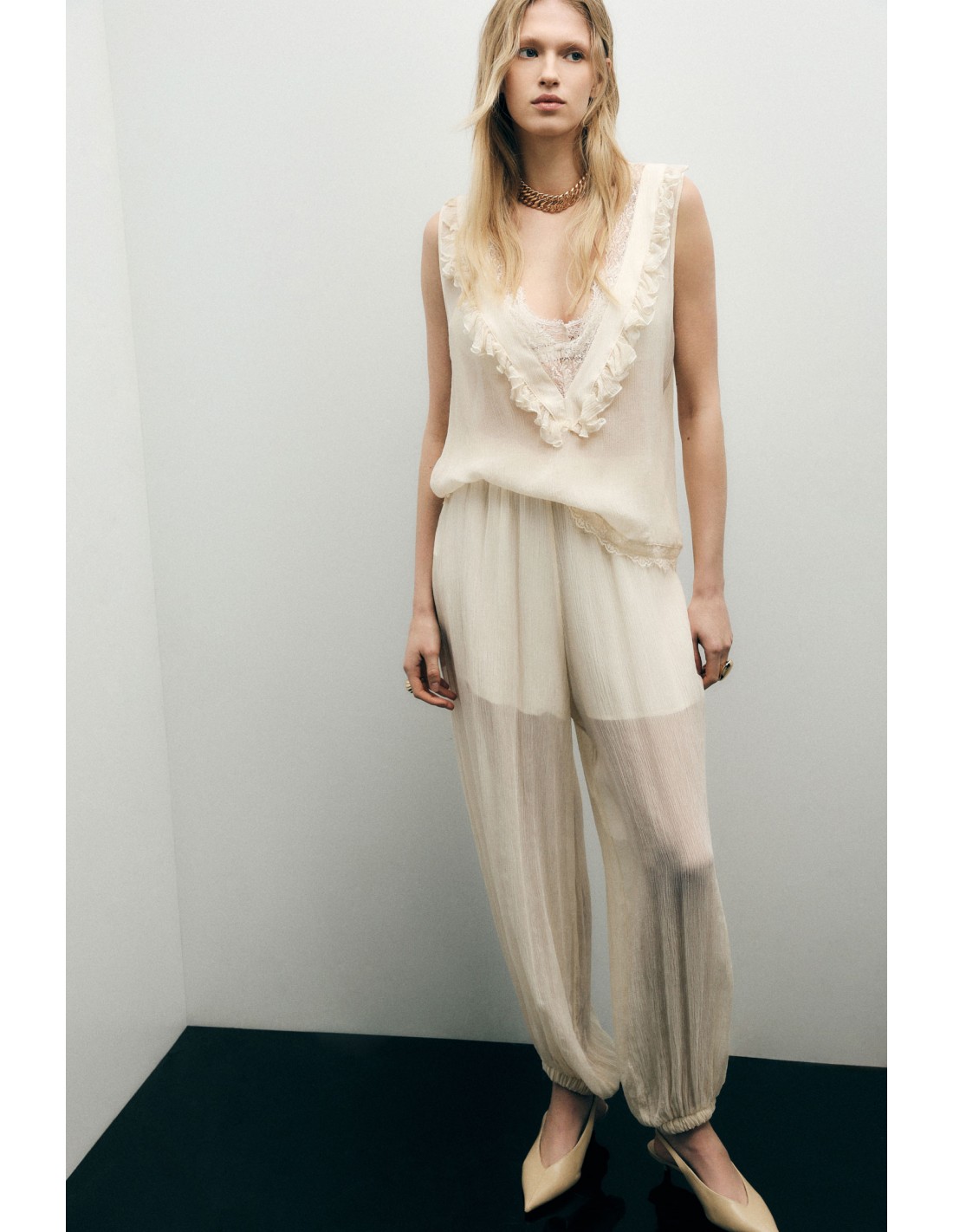 Les bas resserrés viennent équilibrer la coupe en créant un effet jogging maîtrisé, à la fois décontracté et travaillé. Ce pantalon joue sur les contrastes entre fluidité et structure, offrant une pièce forte facile à intégrer dans un vestiaire quotidien ou plus habillé.